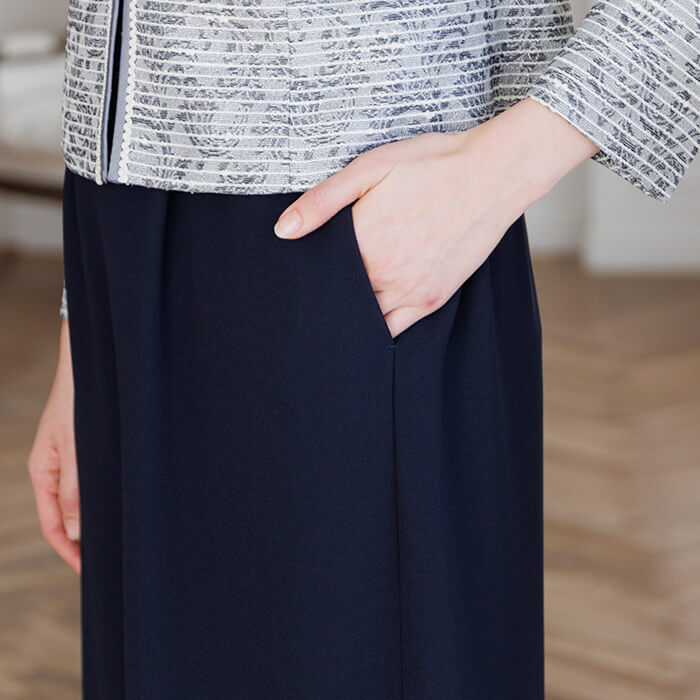 洗濯方法:ご自宅で洗濯可 左脇ファスナー 後ろウエストゴム仕様(+16.5cm伸長) 両脇ポケット付き 両脇吊りテープ付き ※モデル着用: ジャケット / 6410206-91 イヤリング / 5552454-91 ネックレス / 5519810-10 コサージュ / 5504862-80 バッグ / 5529801-91 ※モデル:身長167cm 9号着用 |