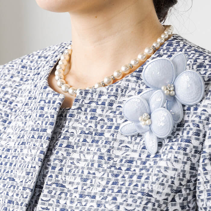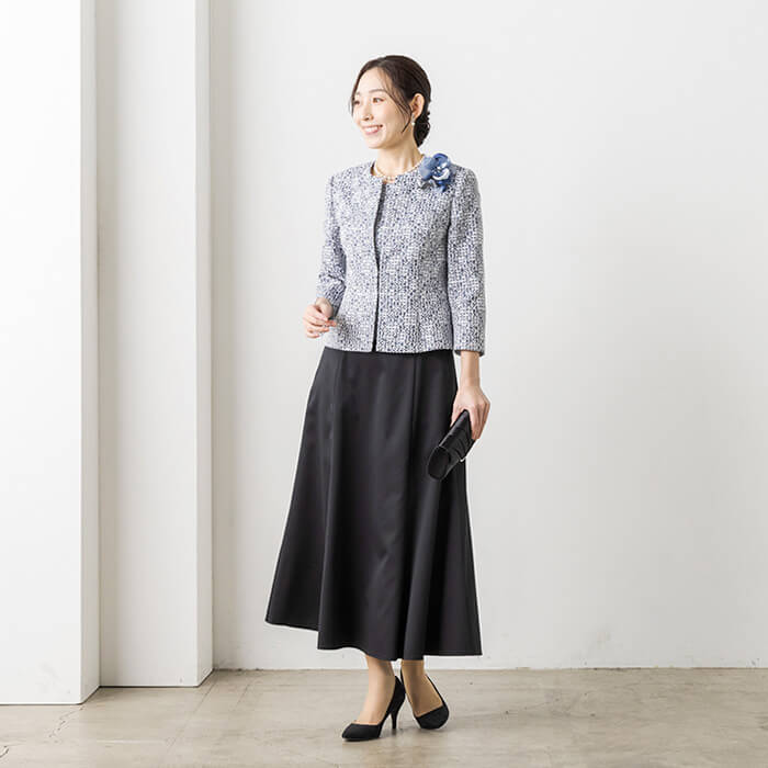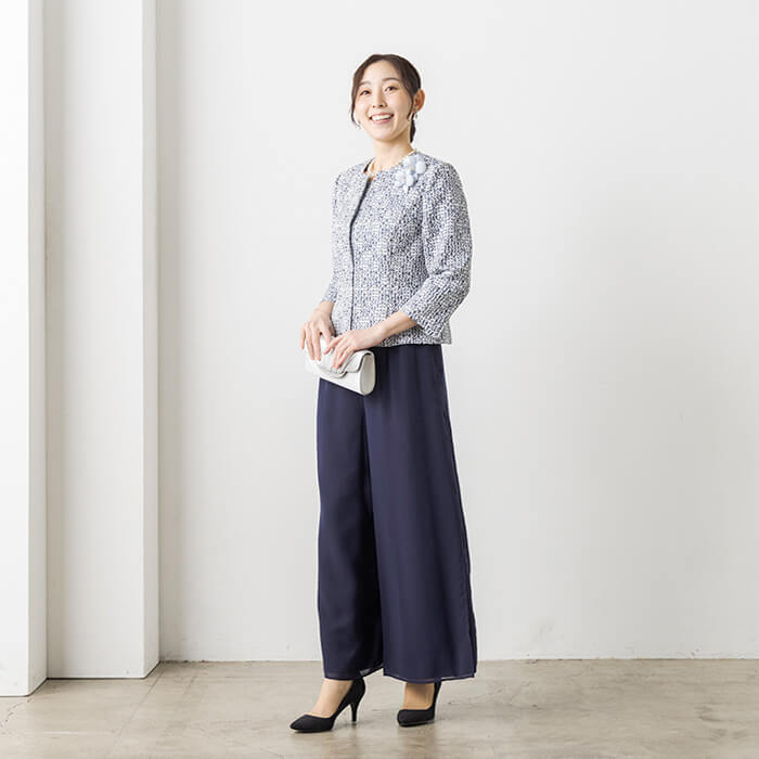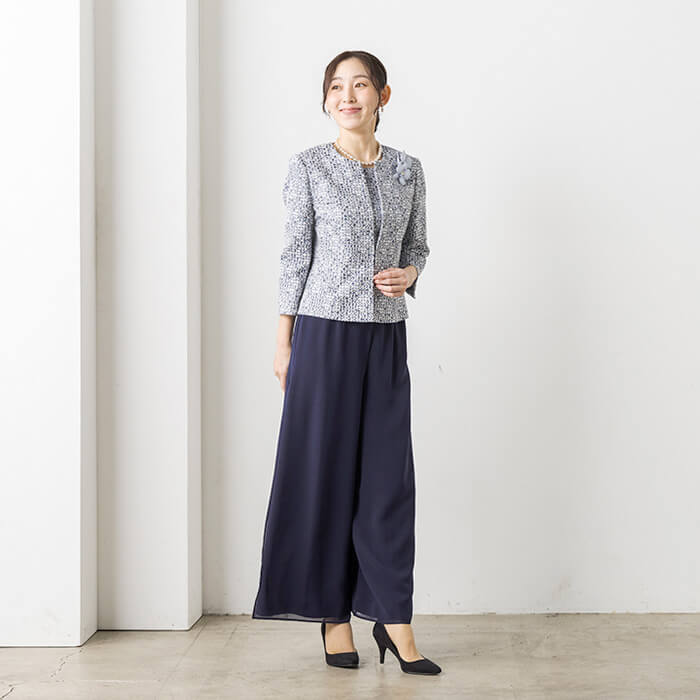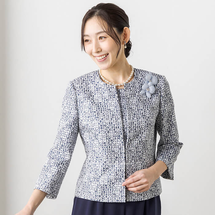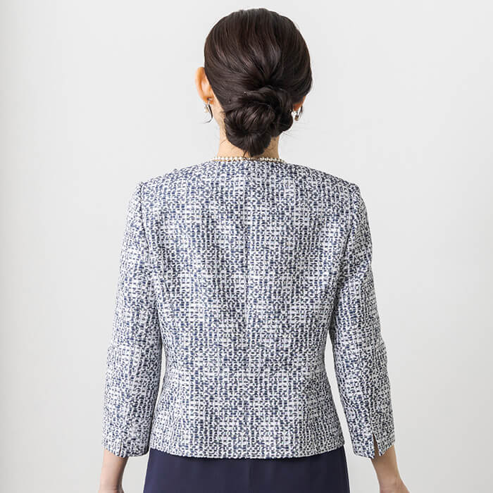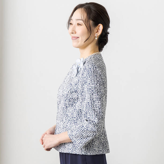 結婚式でのお母様やゲスト・お顔合わせ、クルージングなどの各種パーティーやお食事会におすすめのジャケット。「少しゆったり」パターンを使用。「標準」に比べて、背渡りや二の腕にゆとりを持たせた寸法です。
