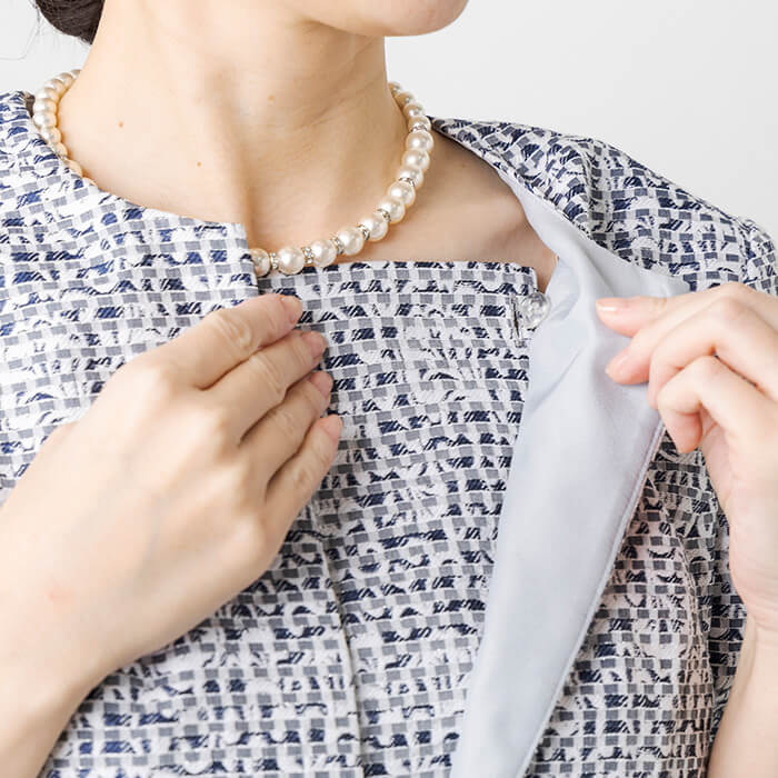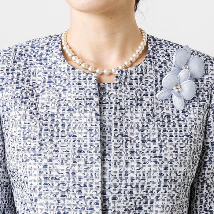 チェック柄ベースの繊細な織柄と清涼感のあるミックスカラーがさわやかなジャカード素材を使用。控え目なラメ使いやコットンを使用したナチュラルな素材感なので、ドレスアップも少しきちんとしたシーンにもなじむオールマイティーでエレガントなジャケットです。共生地の胸当てが付いているため、中のインナーの心配することなく着用できます。 胸当てをつけて、スカートやパンツ(6405251・1405301・6407902)とのコーディネートもおすすめです。またワンピース(6401341・6401770)の羽織りとしても素敵なジャケットです。