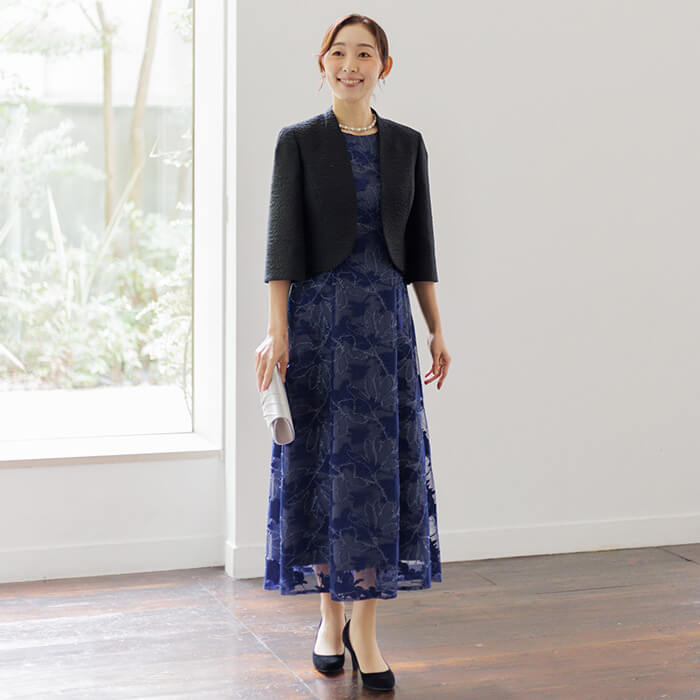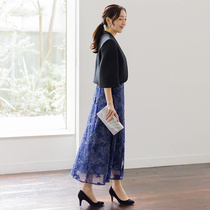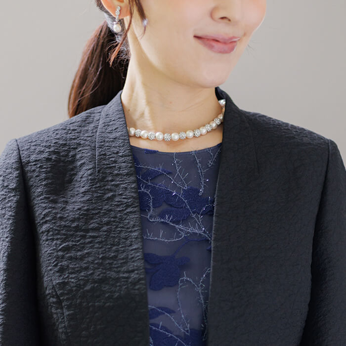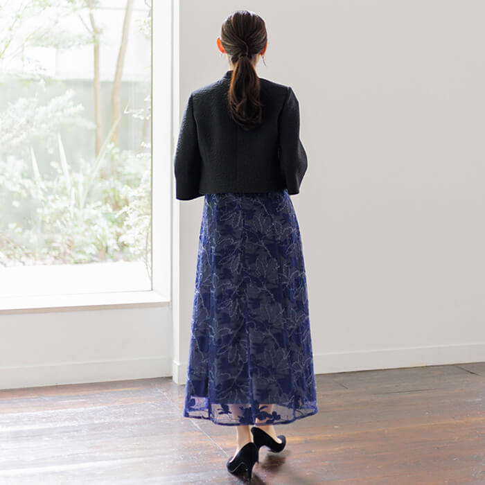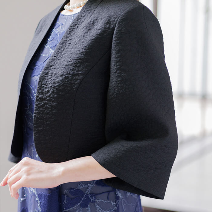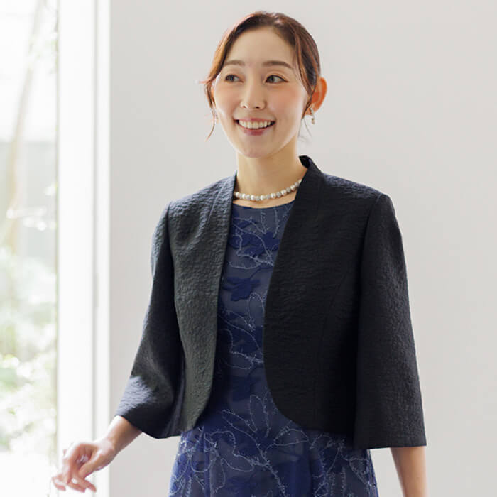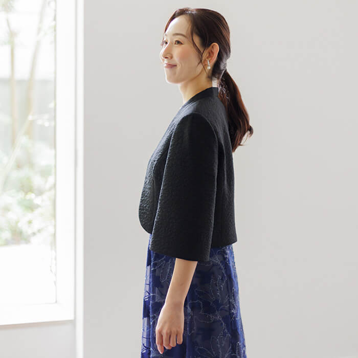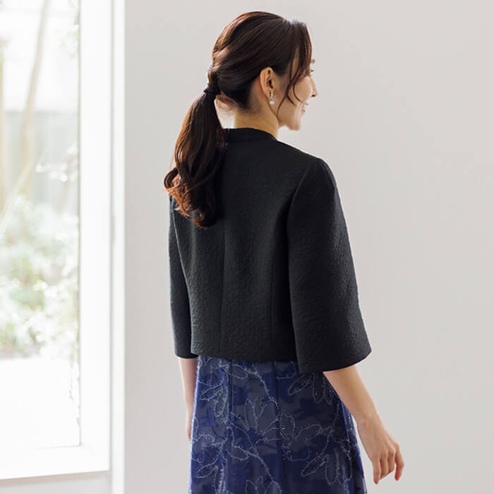 シンプルながら洗練された印象を与えるノーカラージャケット。首元から裾にかけて緩やかなカーブを描くフロントラインが女性らしい柔らかさと上品さを表現。 さりげないスタンドカラーは気になる首元をカバーします。袖は七分丈で肘をしっかり隠し、手元を綺麗に見せます。 高級感のある素材とシンプルなシルエットは、どんなアイテムにも合わせやすい優秀アイテム。 結婚式ではお母様やゲストの立場の方、各種パーティや式典にもおすすめです。 季節にかかわらずオールシーズンご着用いただけます。