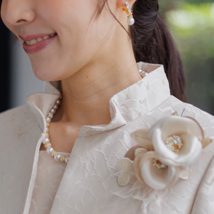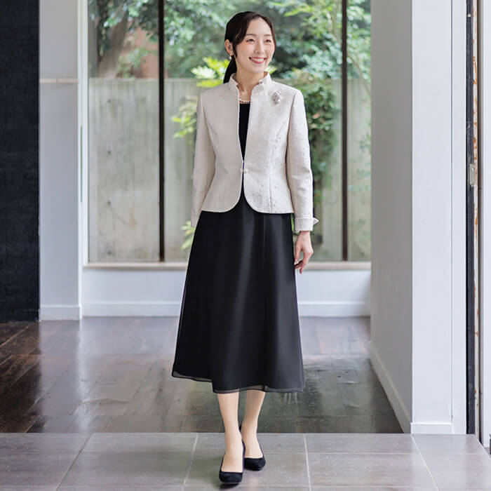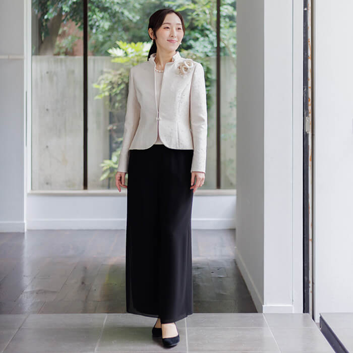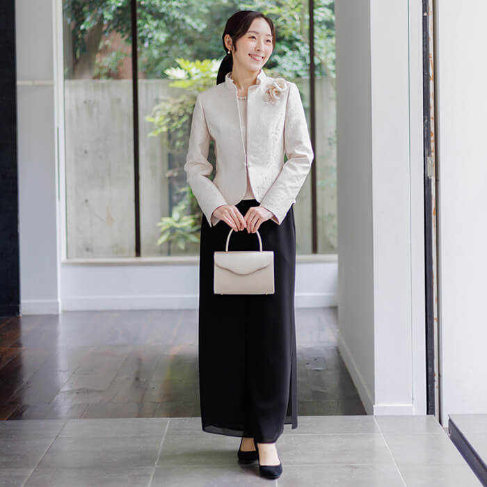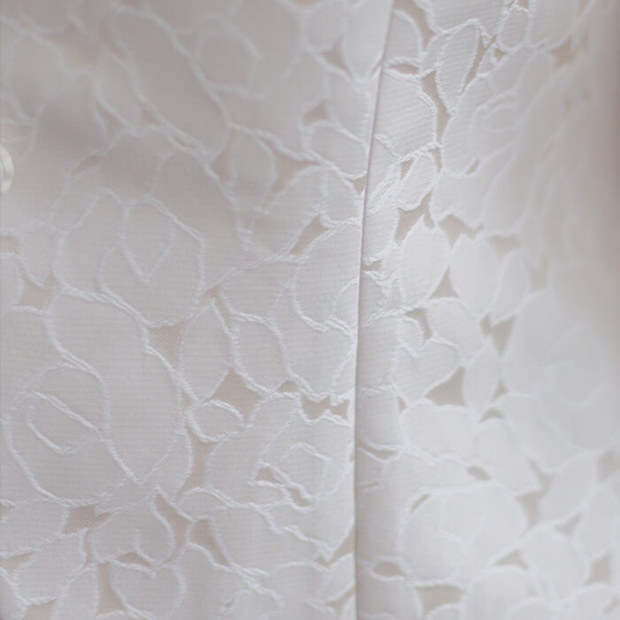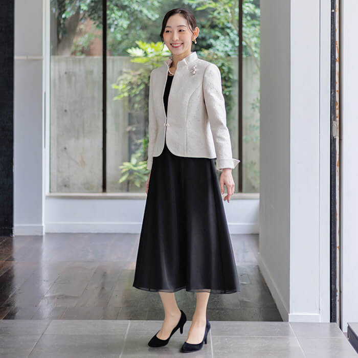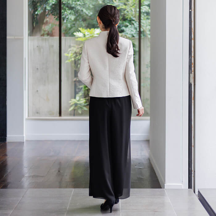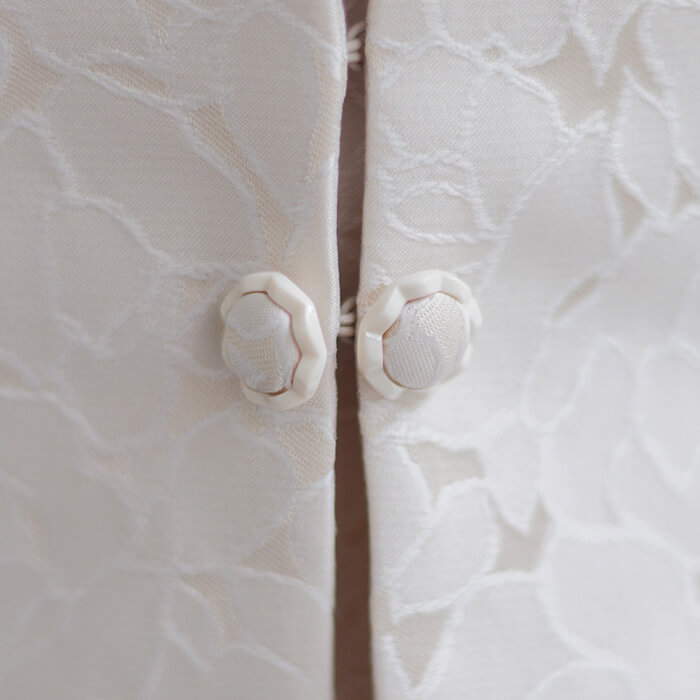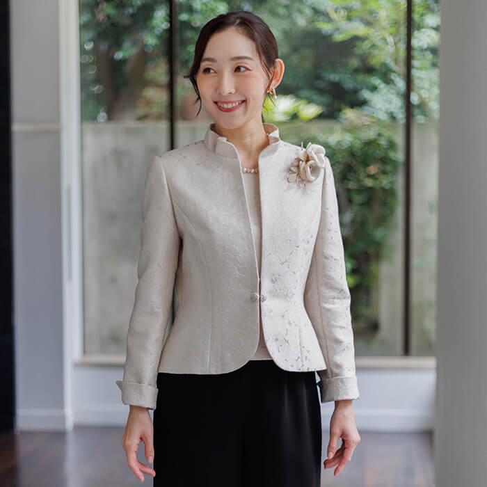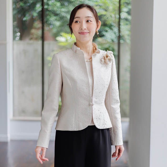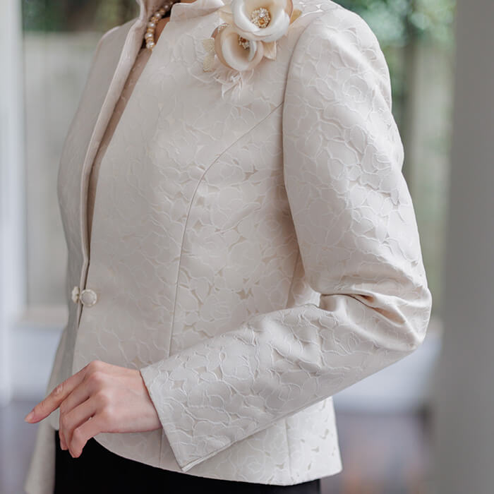 若々しく高級感のあるジャケット。糸の光沢感を活かし、陰影を引き出した上品なジャカードが主役です。ウエストに絞りをいれたデザインで、すっきり細く見えるシルエットラインがポイント。花モチーフのカギホックがアクセントに。 上品なフリルは、首元をカバーしつつ綺麗に見せます。スカートやワンピース、パンツを組み合わせて、結婚式や式典、レセプションなど様々な慶事にオールシーズン着まわせます。新郎新婦のお母様やご親族の正装には、ロング丈のボトムがお勧めです。取り外し可能な胸当てがついているので、インナーの心配なく、コーディネート可能です。