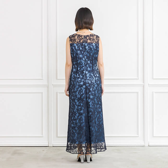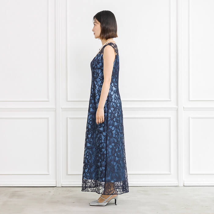 繊細さのあるレースで仕立てたロング丈ドレスは、優雅な印象に。