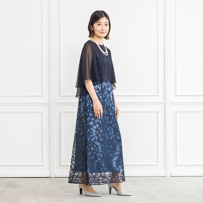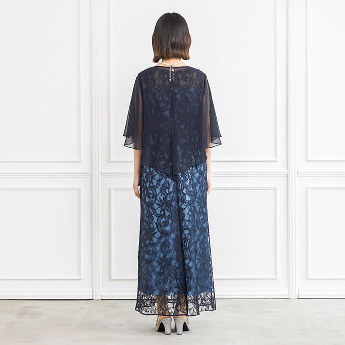 透けすぎない透明感のあるソフトなシフォン素材の羽織りと、光沢感がドレッシーでクラシカルなラッセルレースがポイントのドレスとのセットアイテム。繊細さのあるレースで仕立てたロング丈ドレスは、優雅な印象です。シフォンの羽織りは袖が付いているので、着崩れすることなく綺麗に着こなすことができます。肘も隠れるので安心。頼れるセットアイテムです。