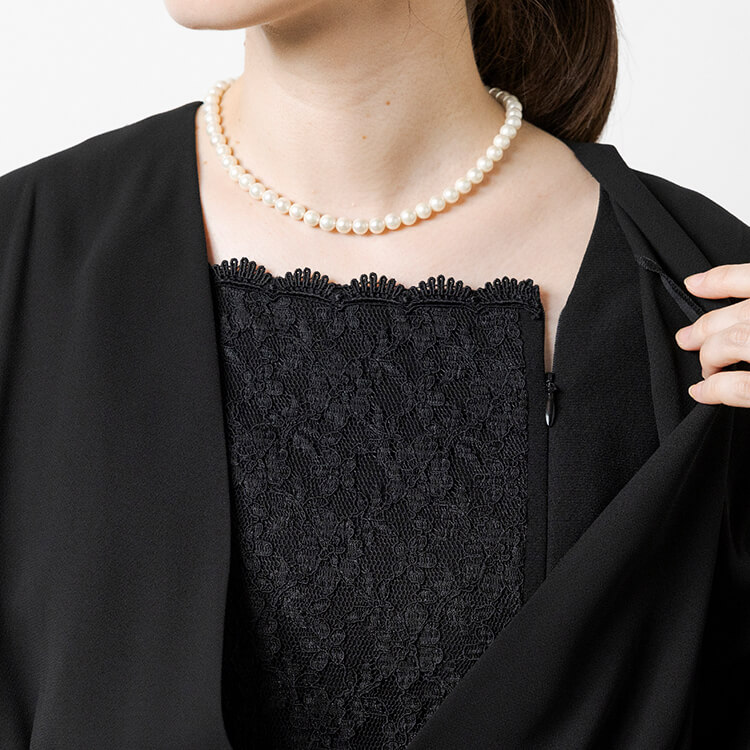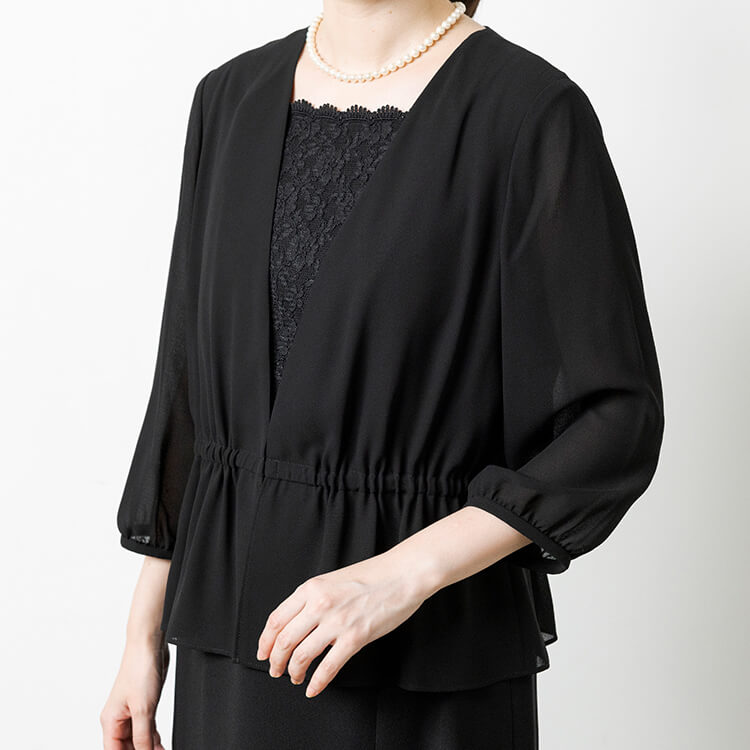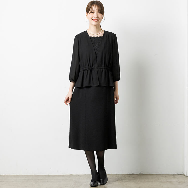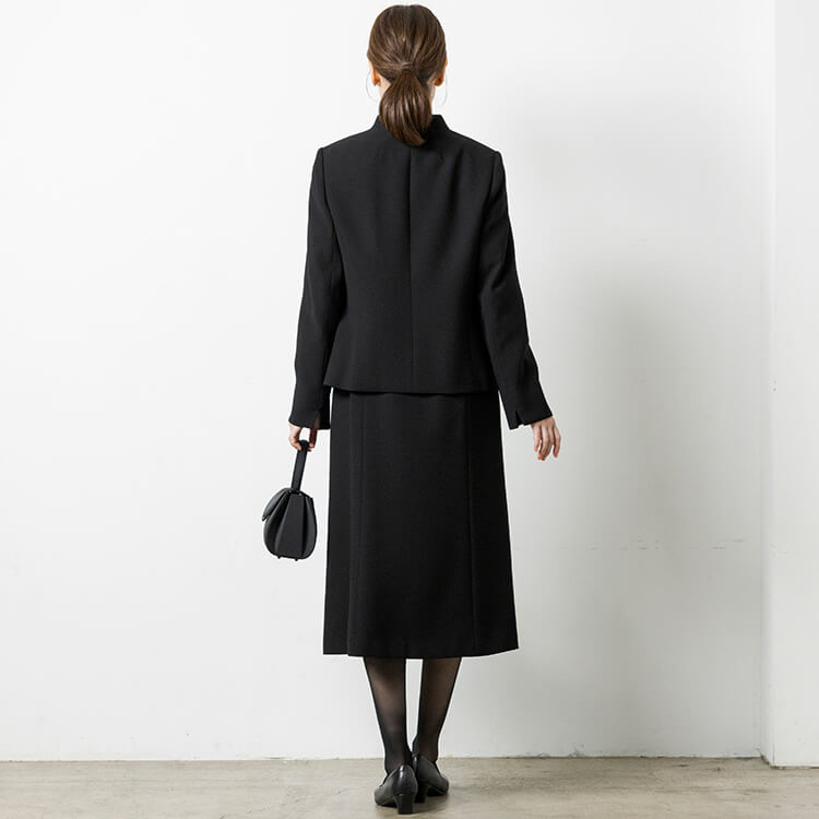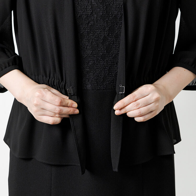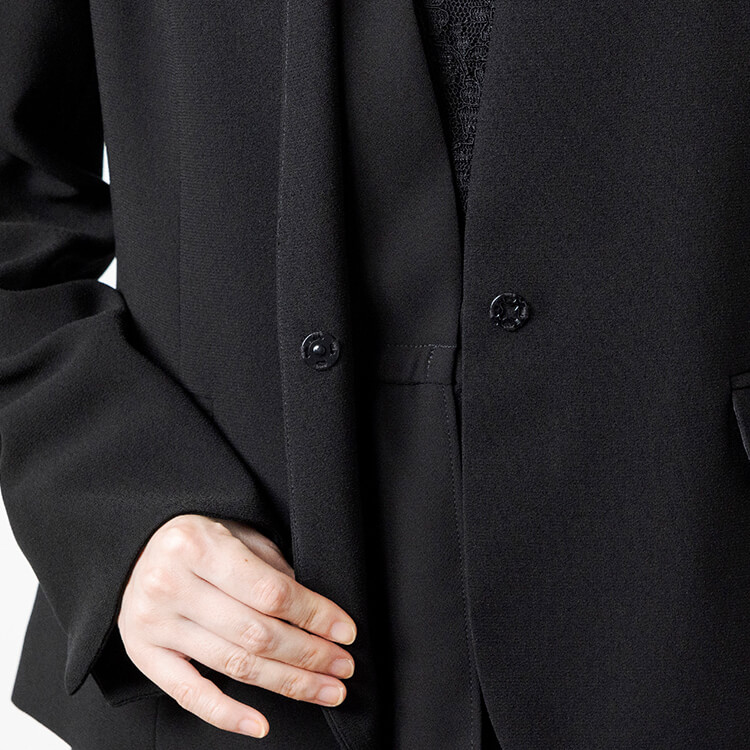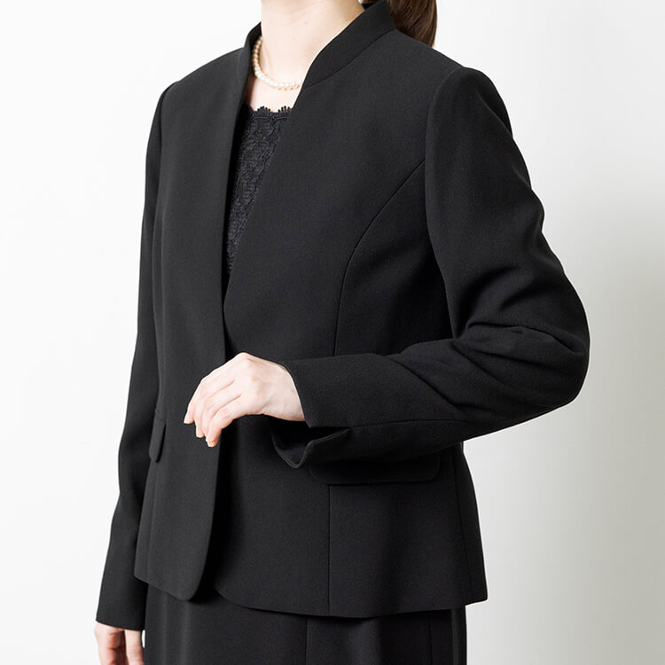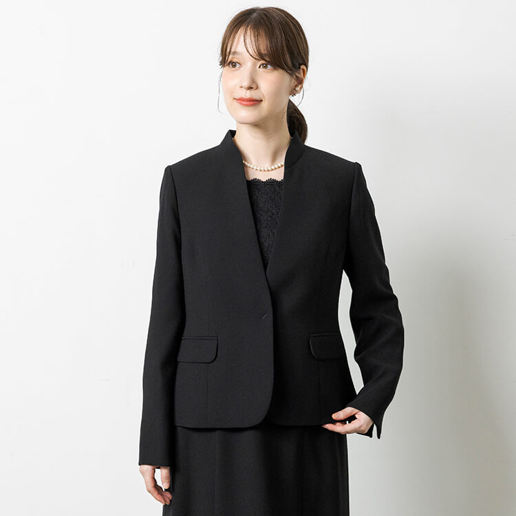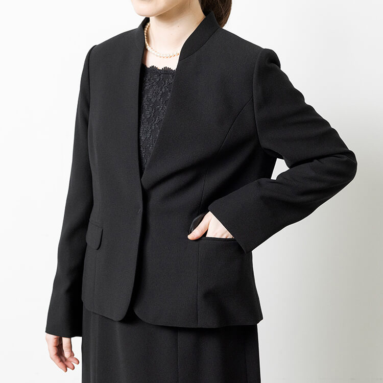 スッキリしたジャケットとレースがフェミニンな前開きワンピースのフォーマルスーツ。 喪服として安心な濃染加工による漆黒で、季節を問わずオールシーズンご着用いただけます。 首元が隠れるスタンドジャラーのジャケットは、高級感のあるひとつボタン。 袖口は折り返せるリターンカフス式、両側にポケットがついています。 ワンピースは、セットアップに見える一枚仕立てのトリックワンピース。 胸元のレースがフェミニンで、左胸部分にファスナーがある前開きです。 ワンピースは右側にポケットがついています。