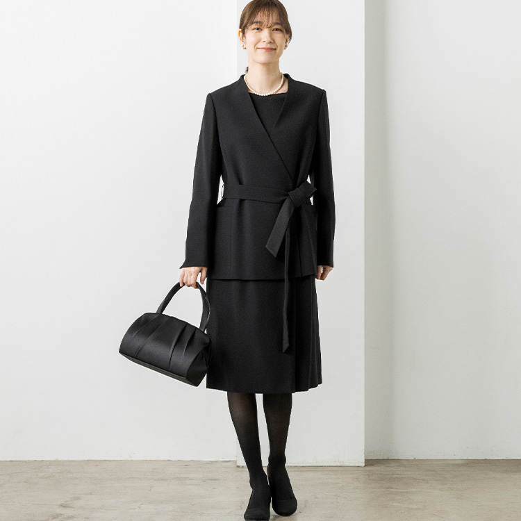 ベルト付きラップ式ジャケットとストレートワンピースのブラックフォーマル