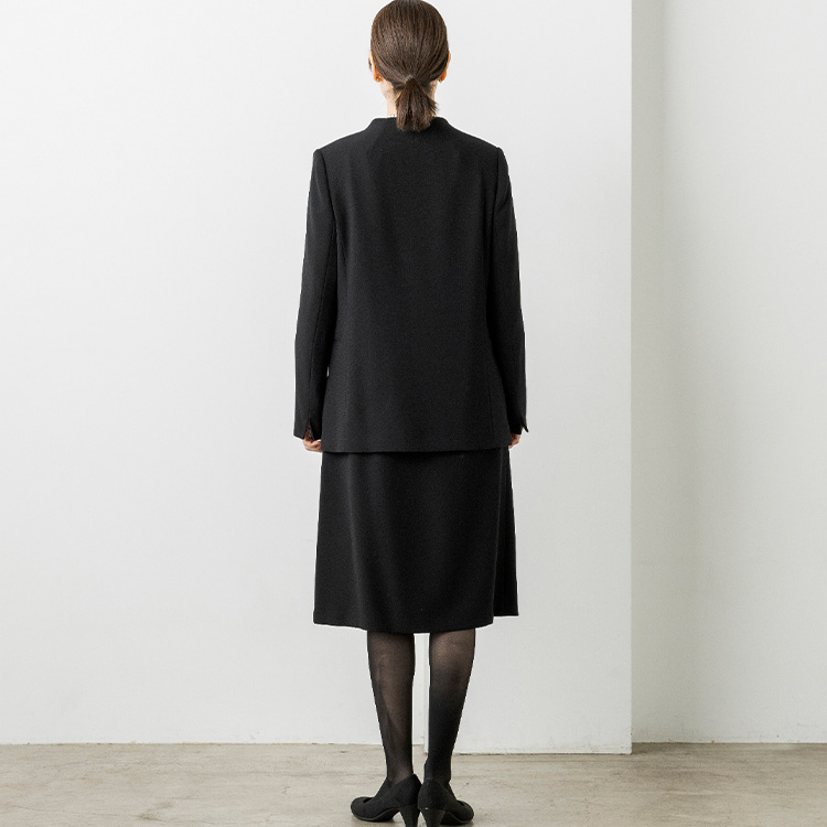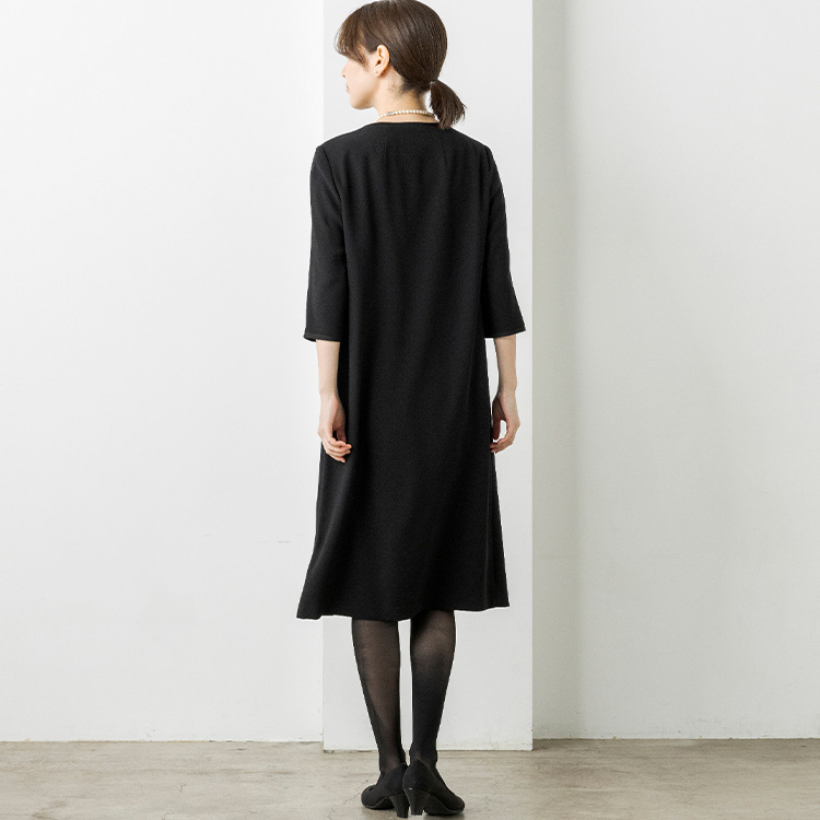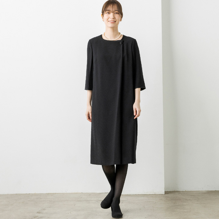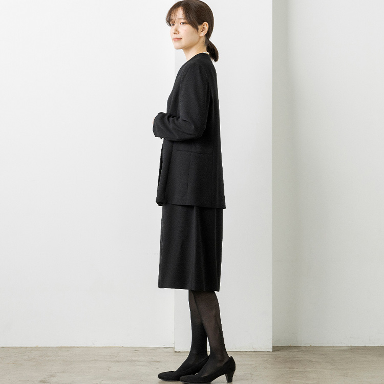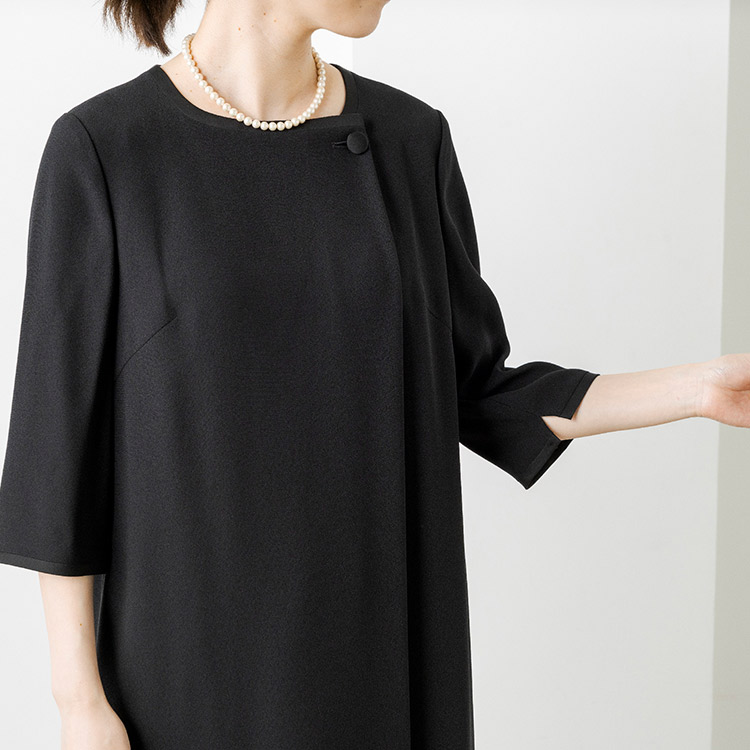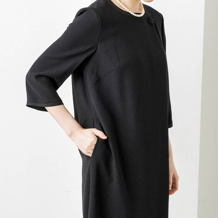 ラップ式ジャケットと絞りのないストレートシルエットの前開きワンピースのセットアップ。 UVカット効果のある生地は、喪服としても安心な濃染加工による漆黒で、季節を問わないオールシーズン用です。 チュニック丈のジャケットは、両側にポケットがあり、ベルトで雰囲気を変えられます。 ワンピースは、絞りのないナチュラルなシルエット、左胸にファスナーがある前開きです。