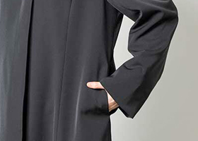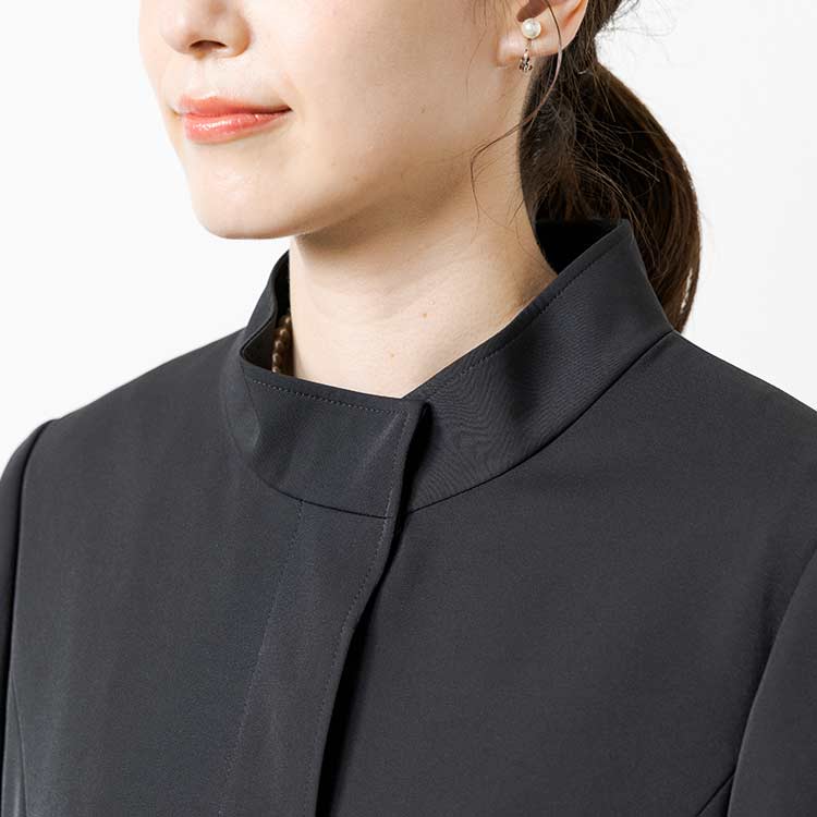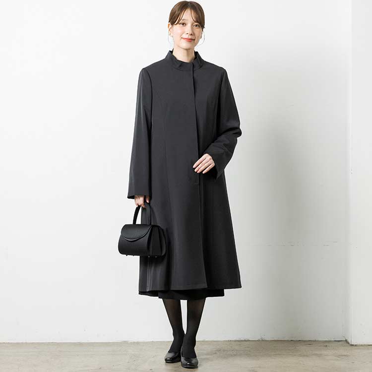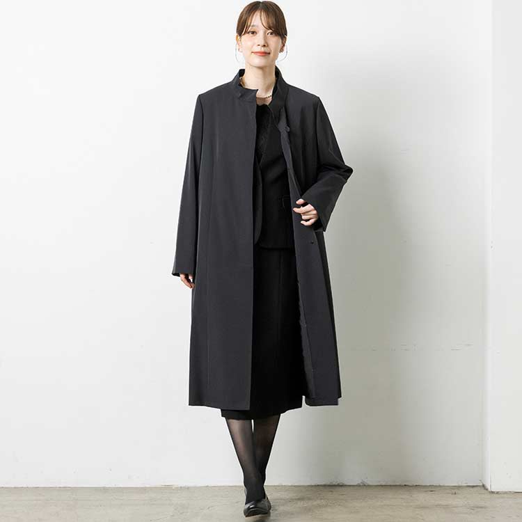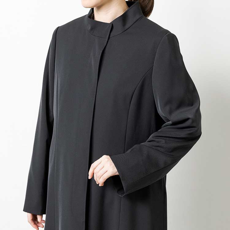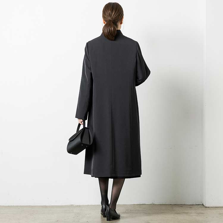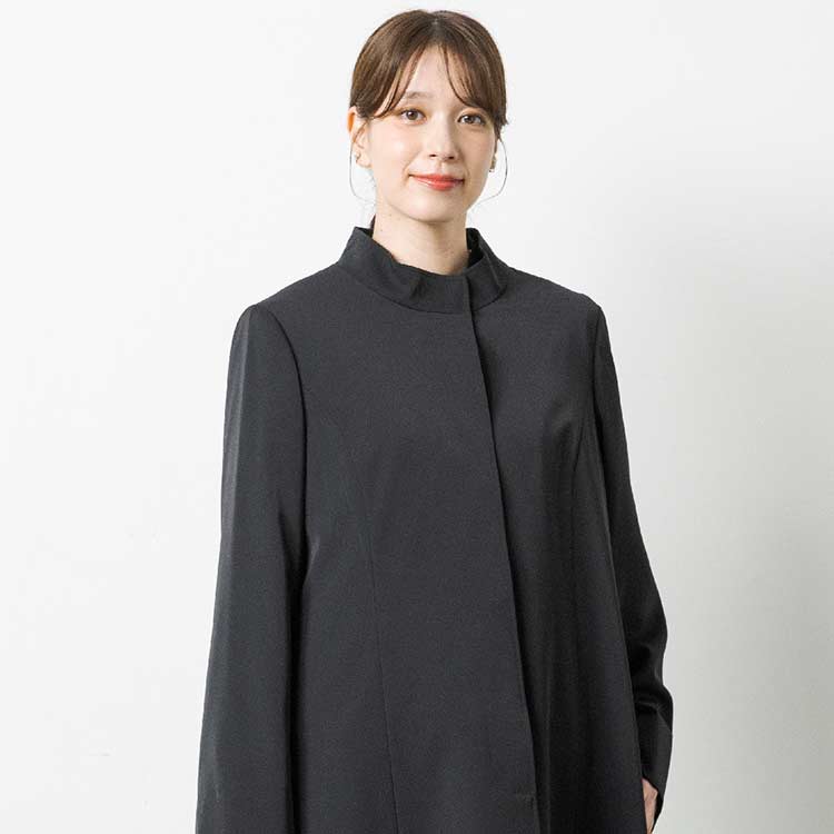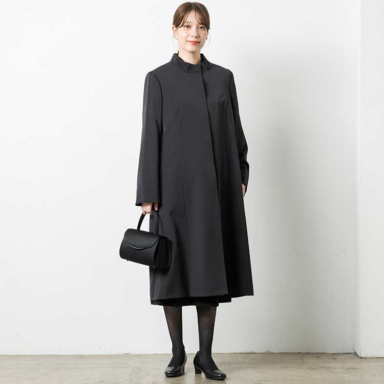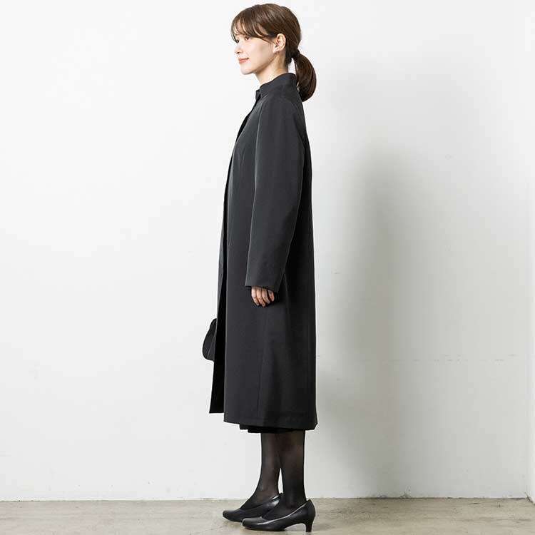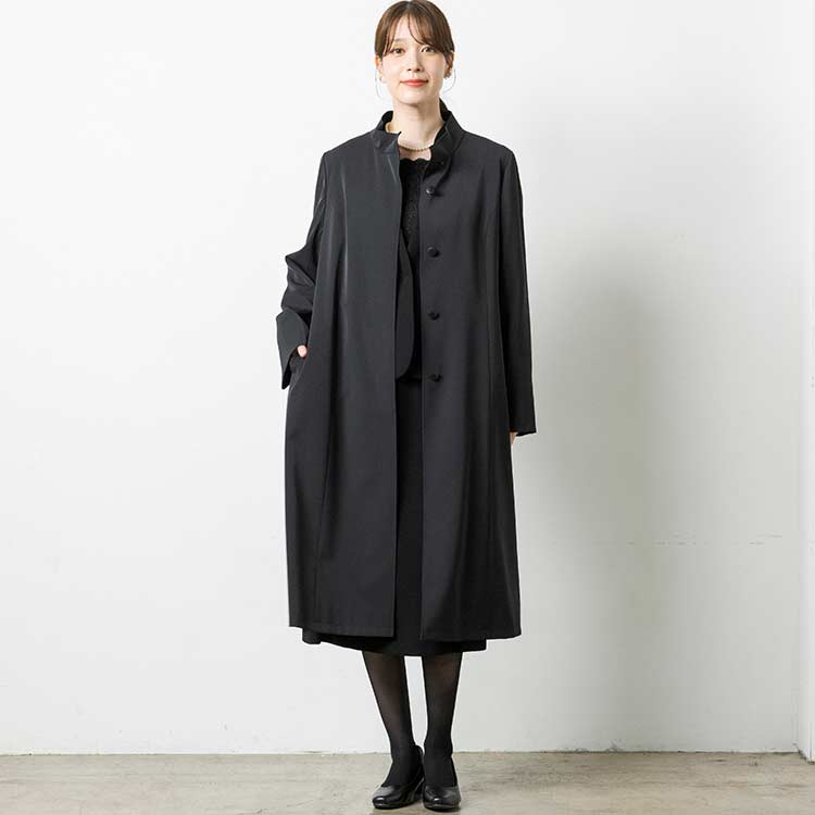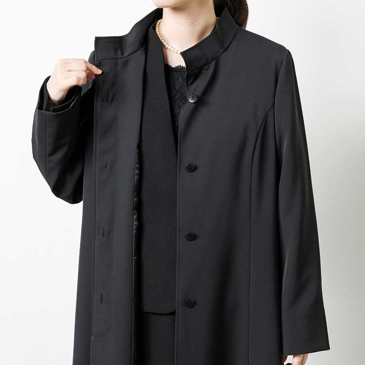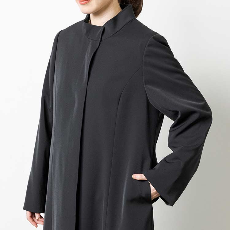 フォーマルシーンにお勧めなスタンドカラーのブラックコート。 トレンドに左右されないクラシカルなデザインで、両側のポケットが便利です。 喪のシーンはもちろんのこと、デイリーに黒のコートとしても着まわせます。 撥水加工の表地は雨の日にも安心です