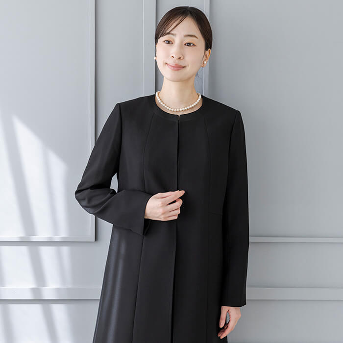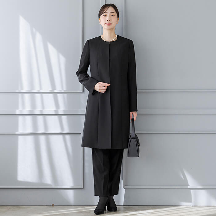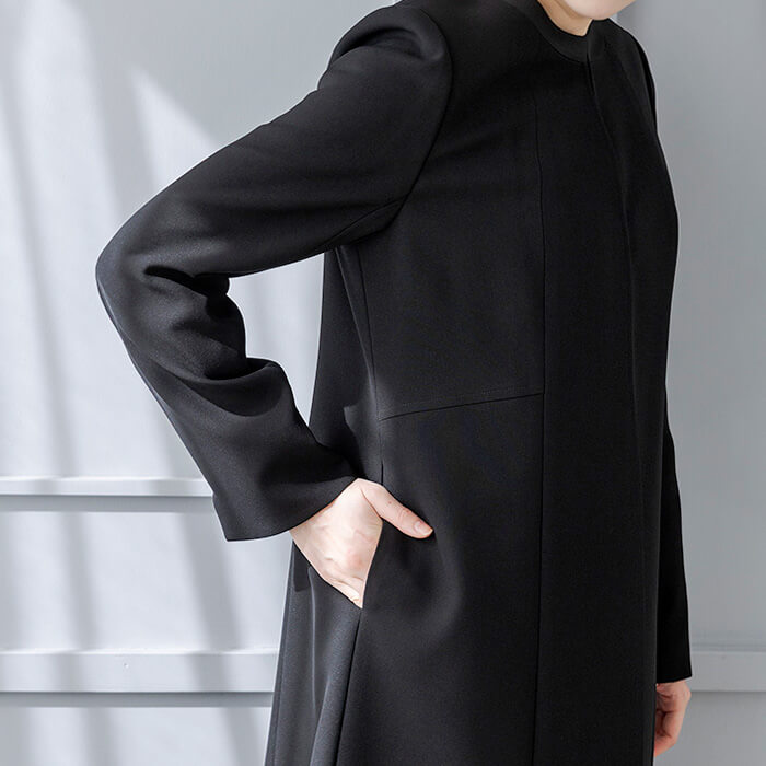 スタイルカバーを叶える人気のロングジャケットは、喪のシーン以外にもセレモニーシーンやお仕事など、黒のコートとしても着回しできます。