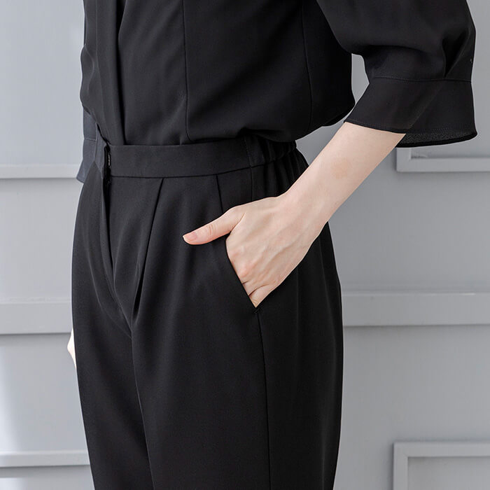パンツはタックを取ったゆったりライン。ワイドなテーパードシルエットは上品でエレガントな雰囲気に。