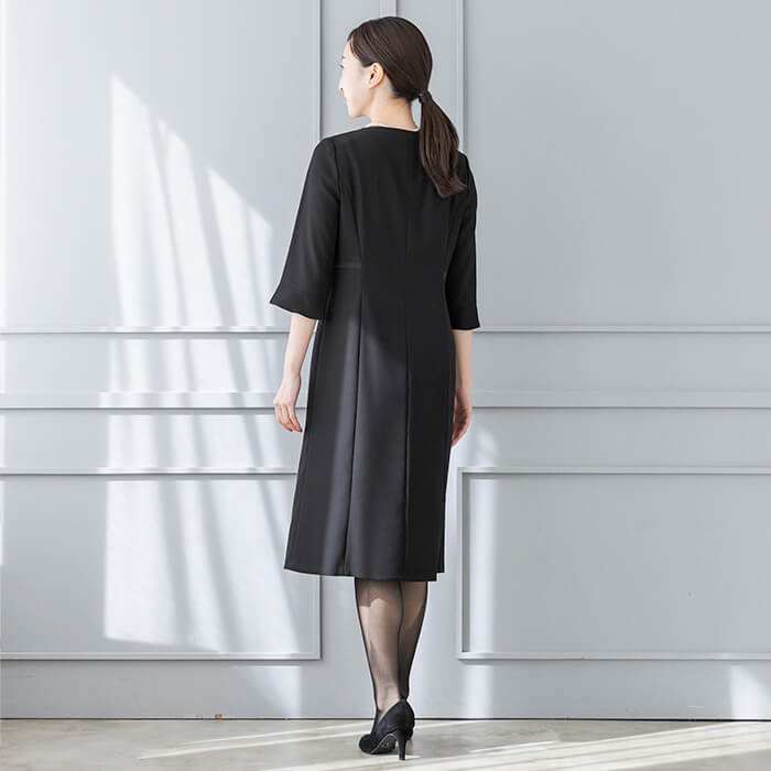 ワンピースは7枚剥ぎデザインのAラインシルエット。気になる腰周りをカバーします。着脱が楽な前開きファスナー付き。