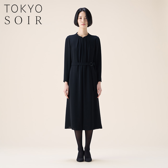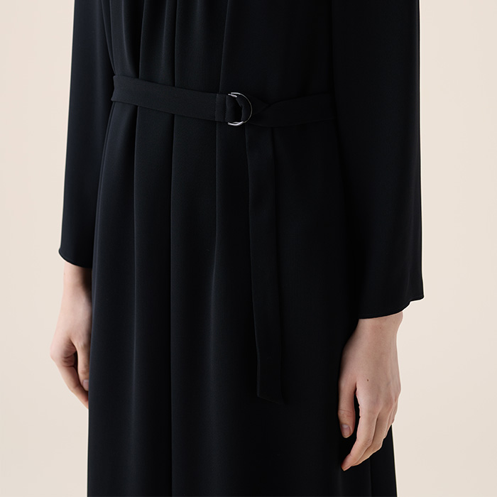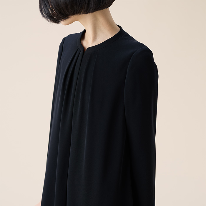 襟元に施した繊細なタックが上品な立体感を演出する、長袖のブラックフォーマルワンピース。
