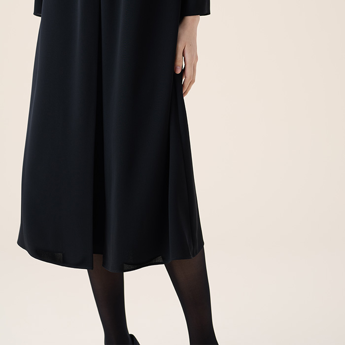 前中心には二カ所のホックを配し、ホックを外すとファスナーが現れる前開き仕様。前中心が開くデザインのため足さばきがよく、見た目の美しさと実用性を両立しています。安心感のある着丈で、身体のラインをやさしく包み込むストレートシルエットです。