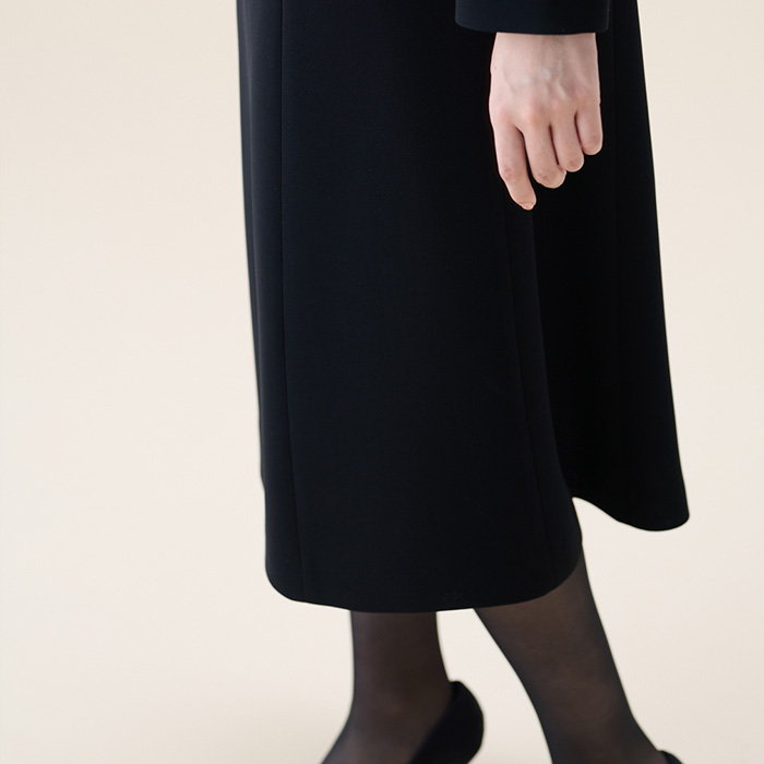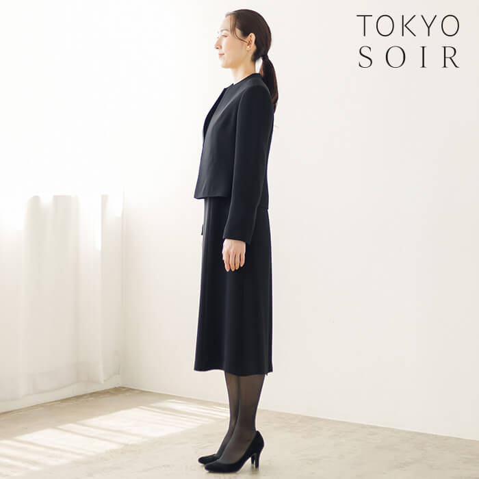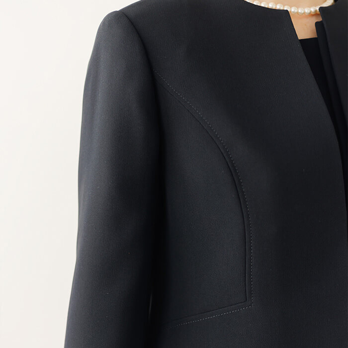 シンプルで王道なノーカラージャケットと着丈長めワンピースのアンサンブル。ジャケットの後ろ襟は2cm程度の立襟でさりげなく首元をカバーすることができます。ワンピースはジャケット着用時の印象変わらないツーピース風のデザイン。ワンピースだけで着用してもきちんと感があります。