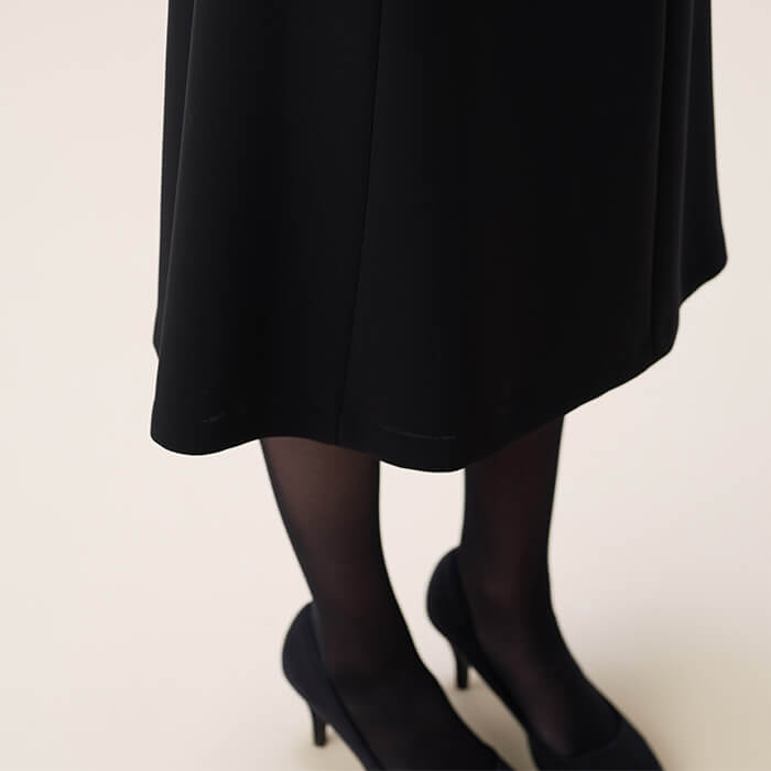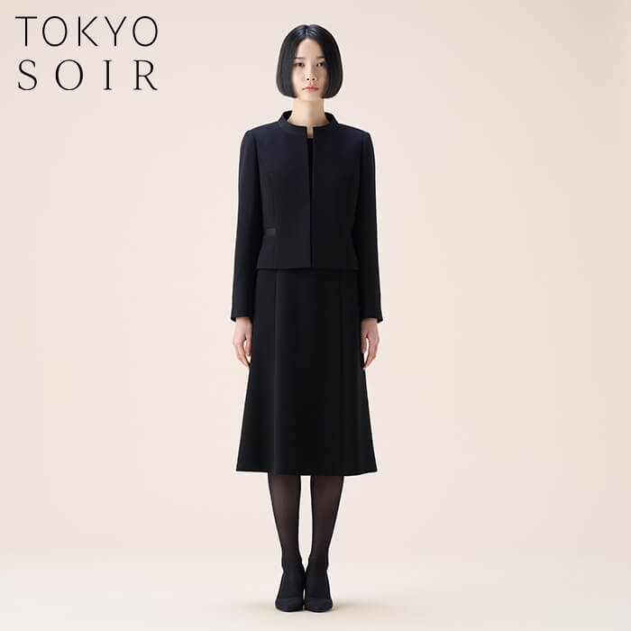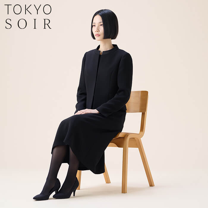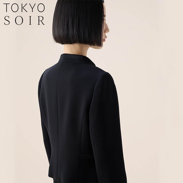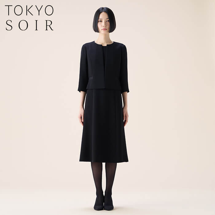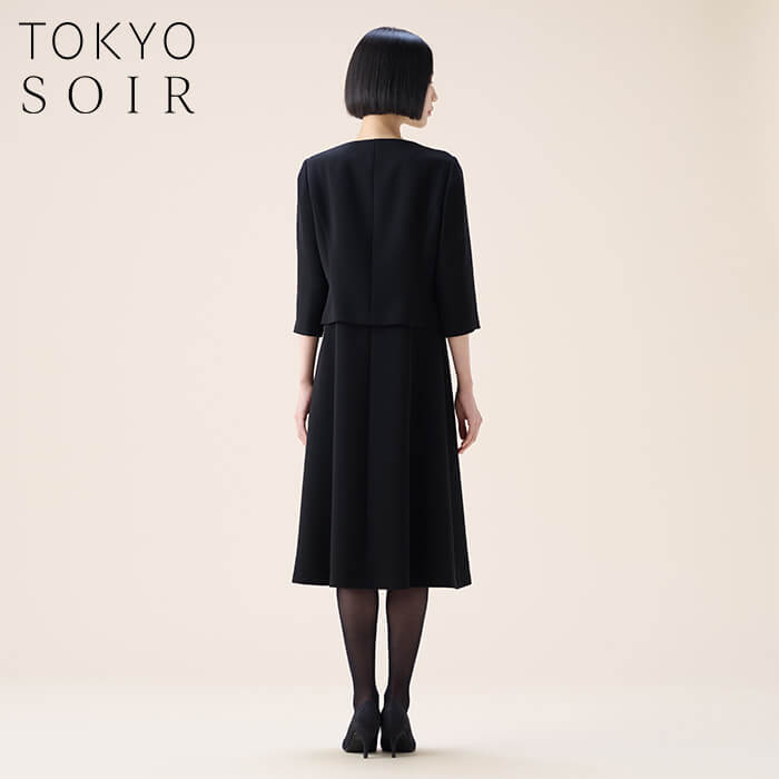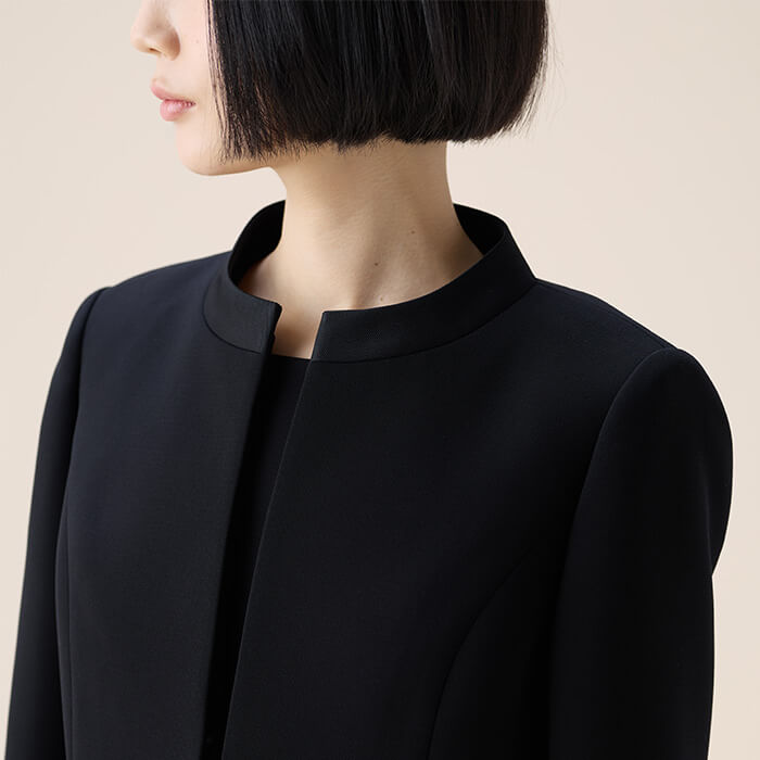スッキリとした印象のスタンドカラージャケットに、七分丈ワンピースをセットした王道のブラックフォーマルアンサンブル。世代を問わず長くご着用いただけるデザインで、ファーストフォーマルとしてもおすすめです。