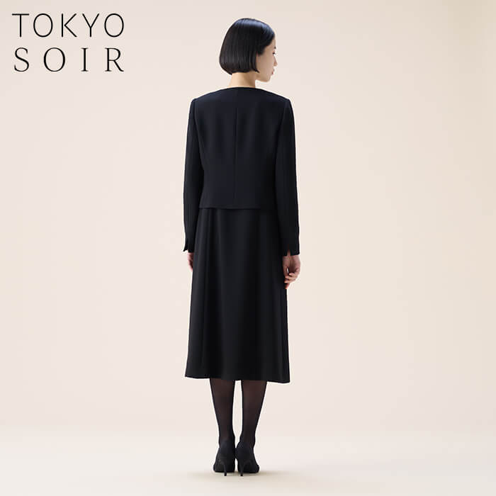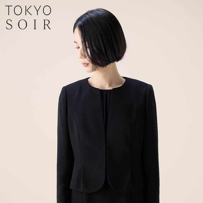 フレッシュな印象のノーカラージャケットワンピースを組み合わせた、軽やかで現代的なブラックフォーマルアンサンブル。