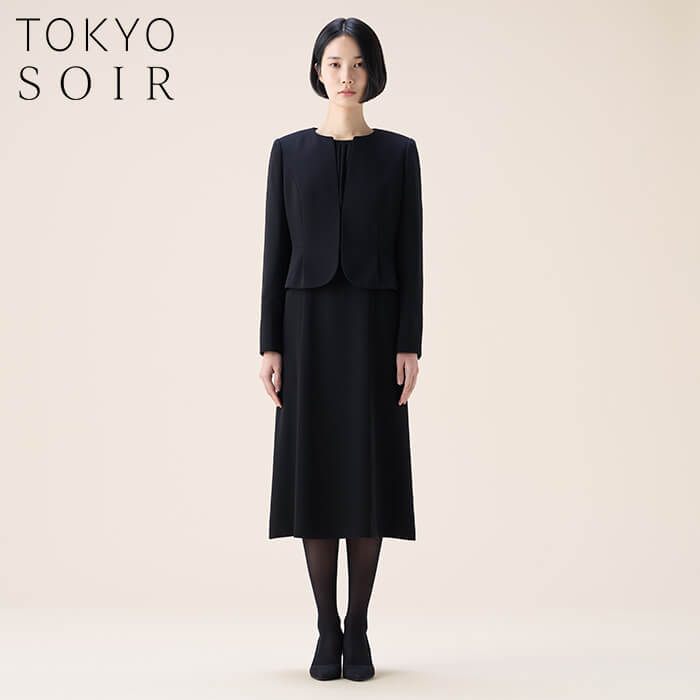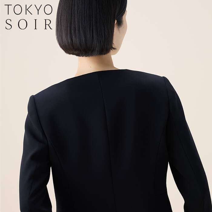 フレッシュな印象のノーカラージャケットワンピースを組み合わせた、軽やかで現代的なブラックフォーマルアンサンブル。