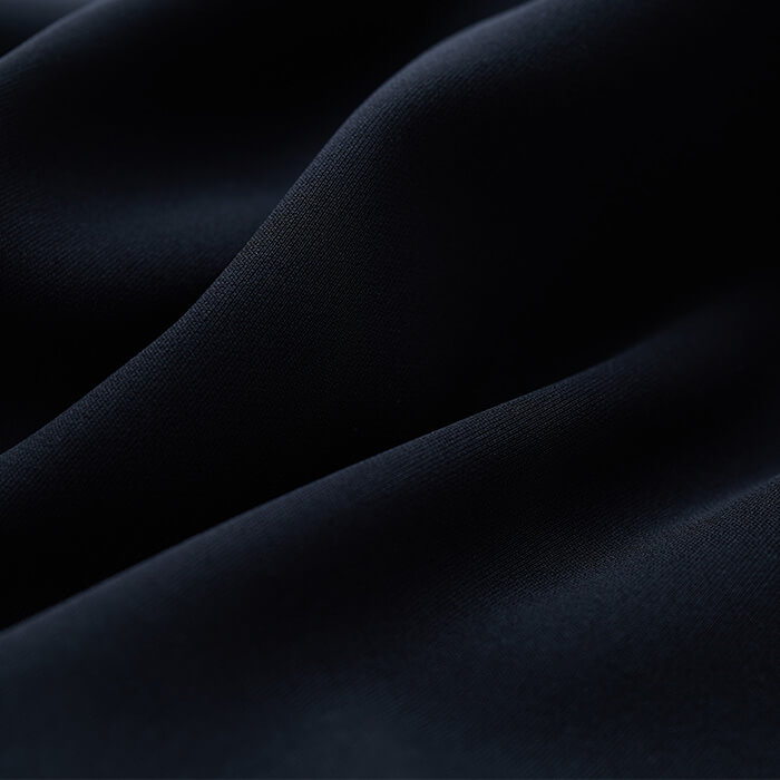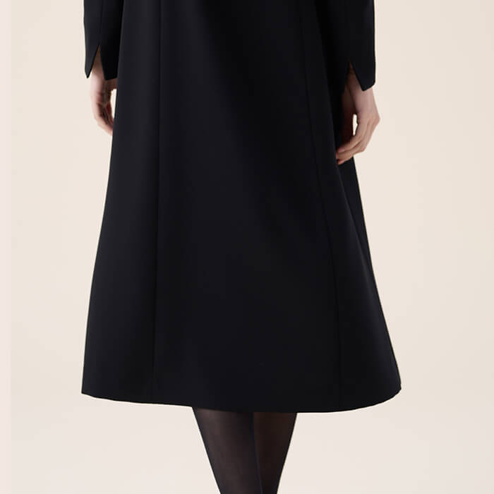 前開き仕様のため着脱がしやすく、ご家庭でのお洗濯が可能な点も実用的。素材にはストレッチバックサテンジョーゼットを使用し、動きやすさと上品な落ち感を両立しました。