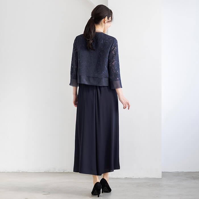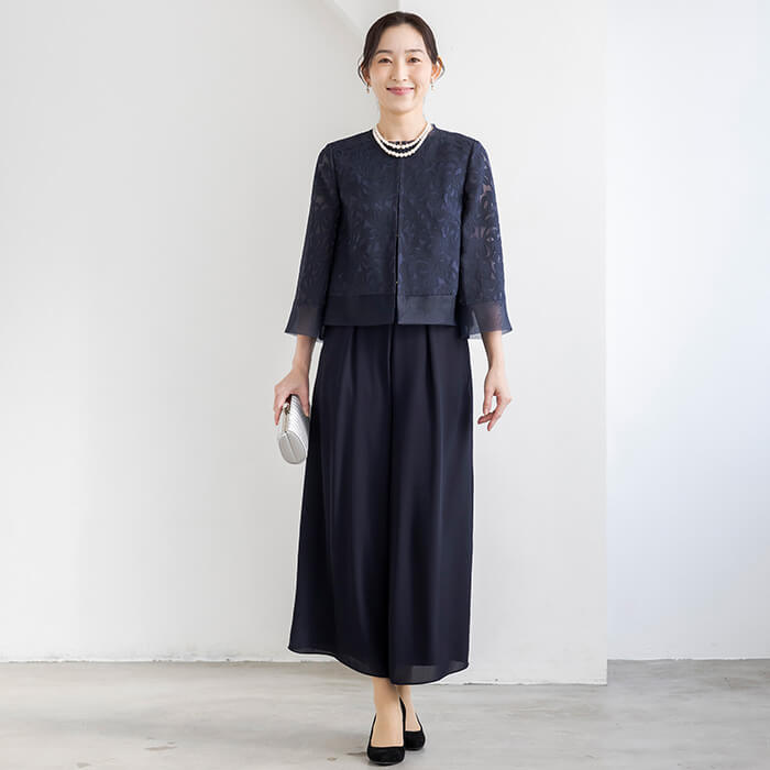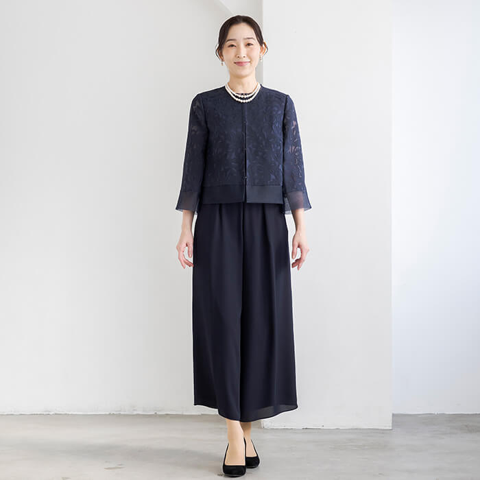 ブライダルから七五三、お食事会など綺麗めなスタイルとして着用できます。ジャケットとパンツの単品コーディネートもおすすめです。 サイズは30代〜40代キャリアの標準的なパターン。