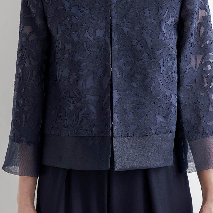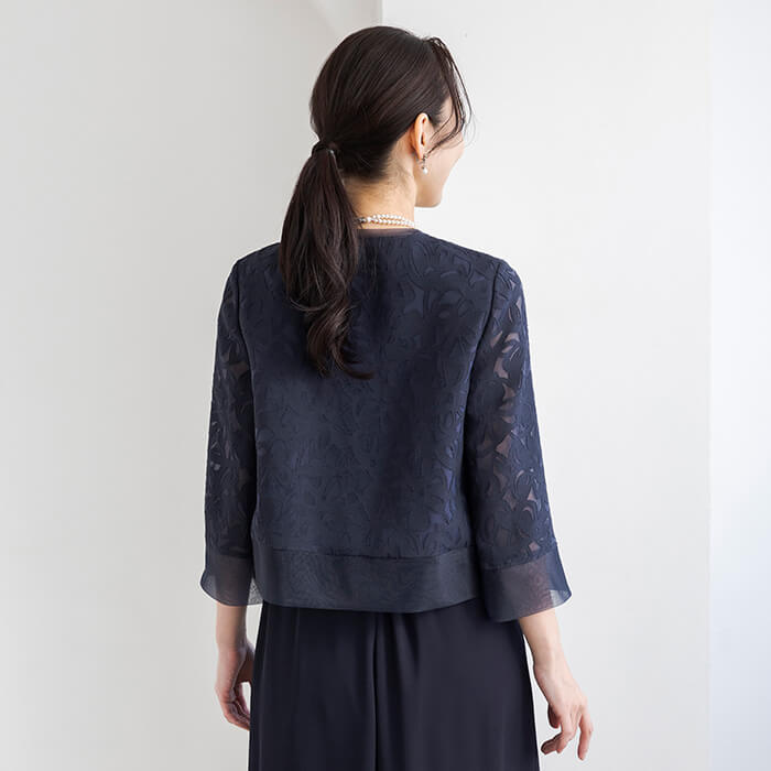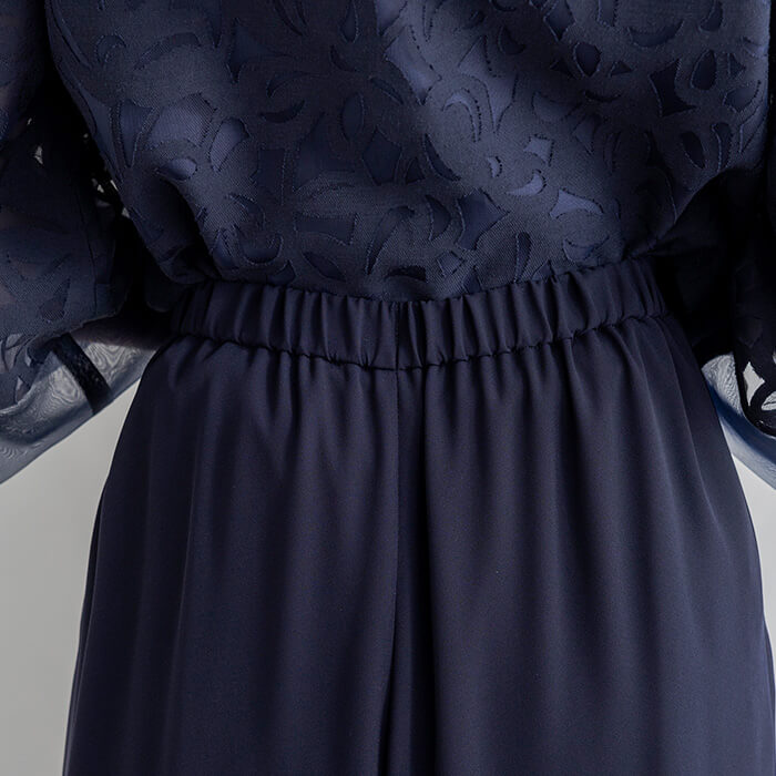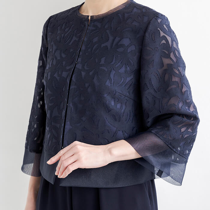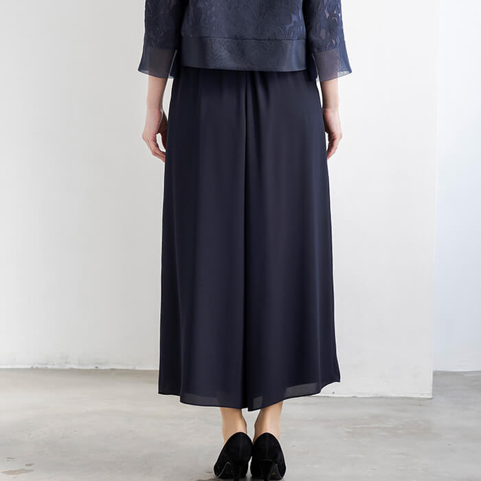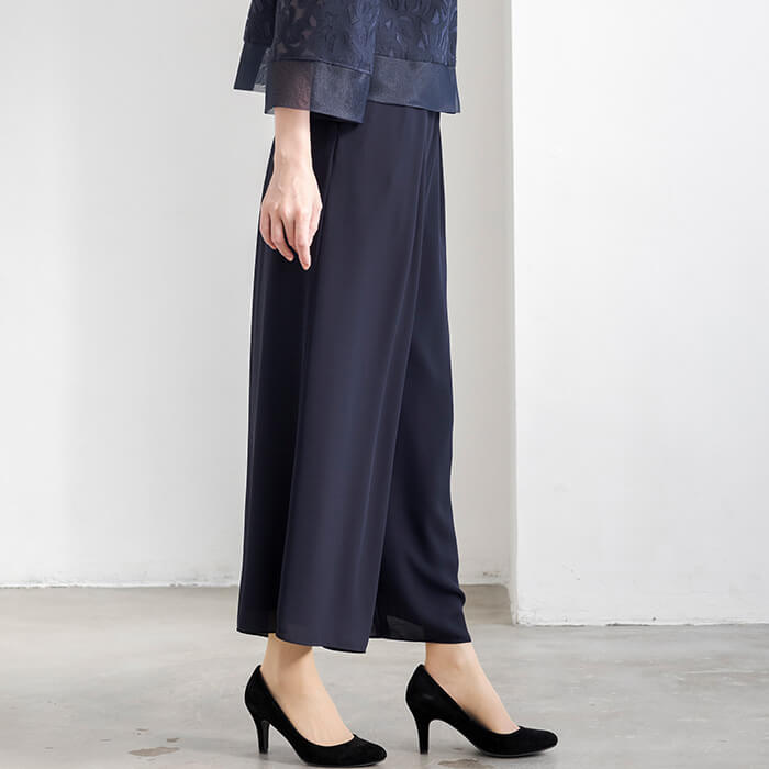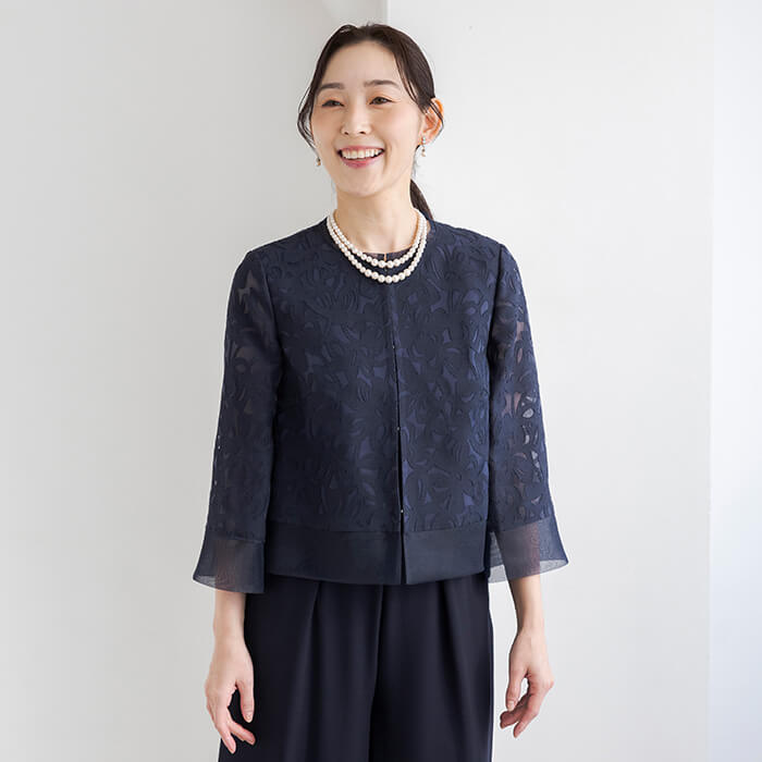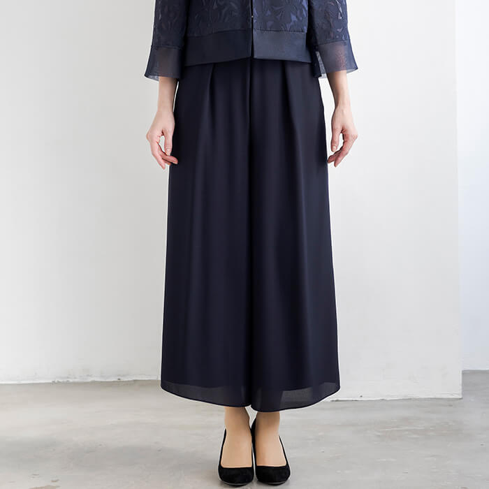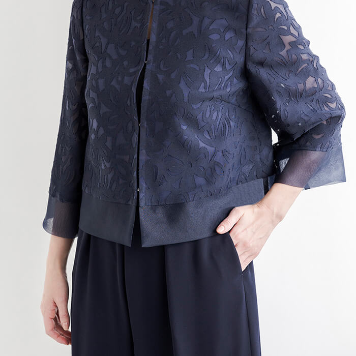 着回し力の高いワイドパンツのセットアップスタイル。ジャケットは、薄手のリネンオパールにチュール裏地を重ね、軽やかで上品な印象に仕上げました。短めの着丈で、ワンピースやスカートともバランスよくコーディネートいただけます。パンツはロングドレスのような優雅さを感じさせる、エレガントなワイドシルエットです。