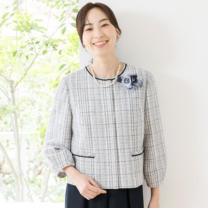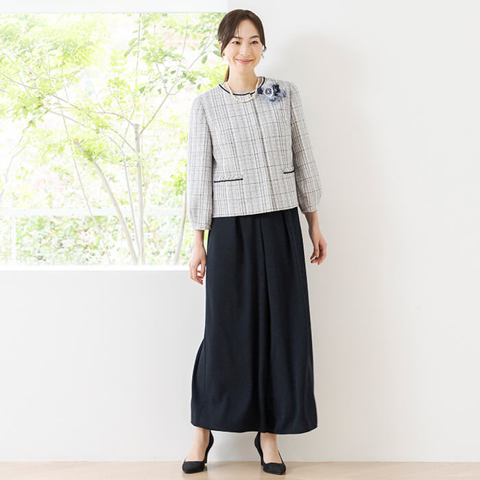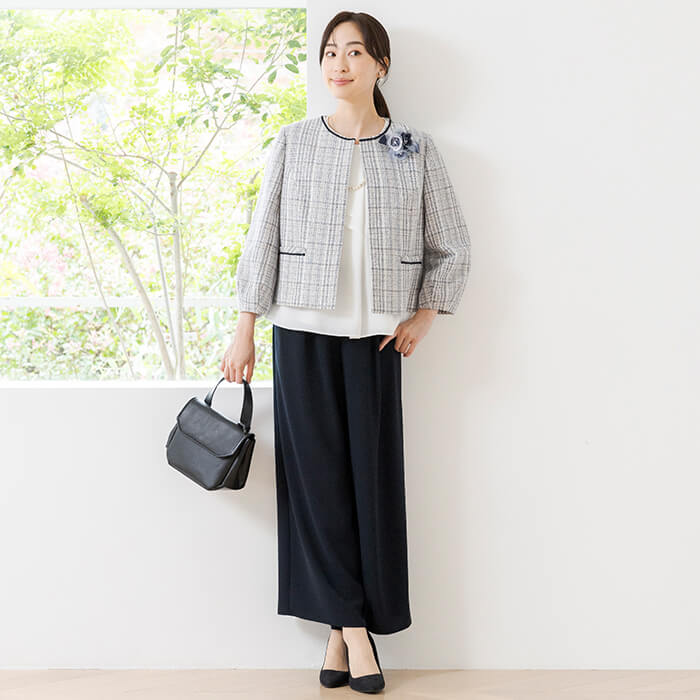 フォーマル感は損なわず、着心地よく着用できる、ツイードジャケット×ワイドパンツのセレモニーセットアップ。