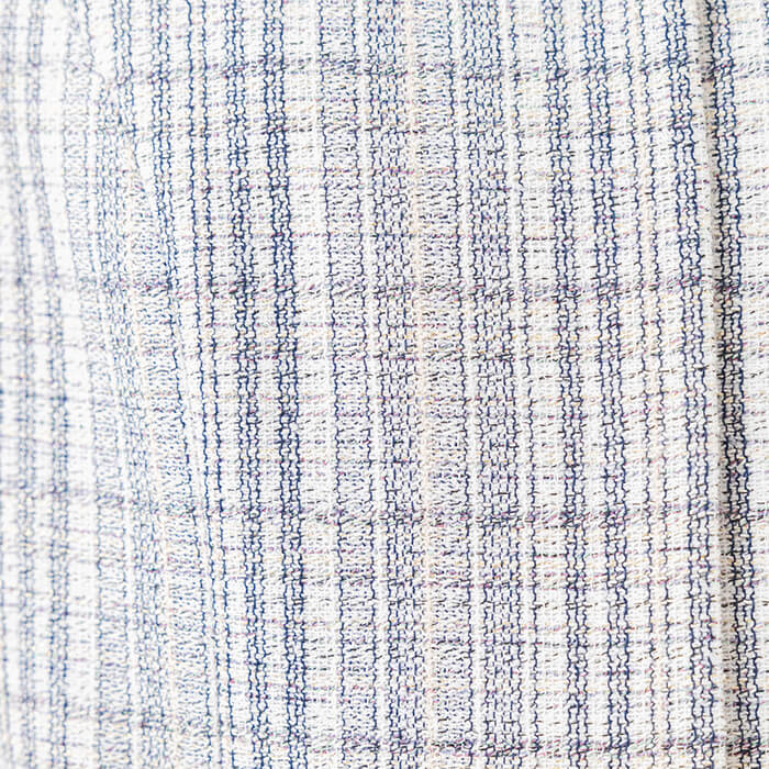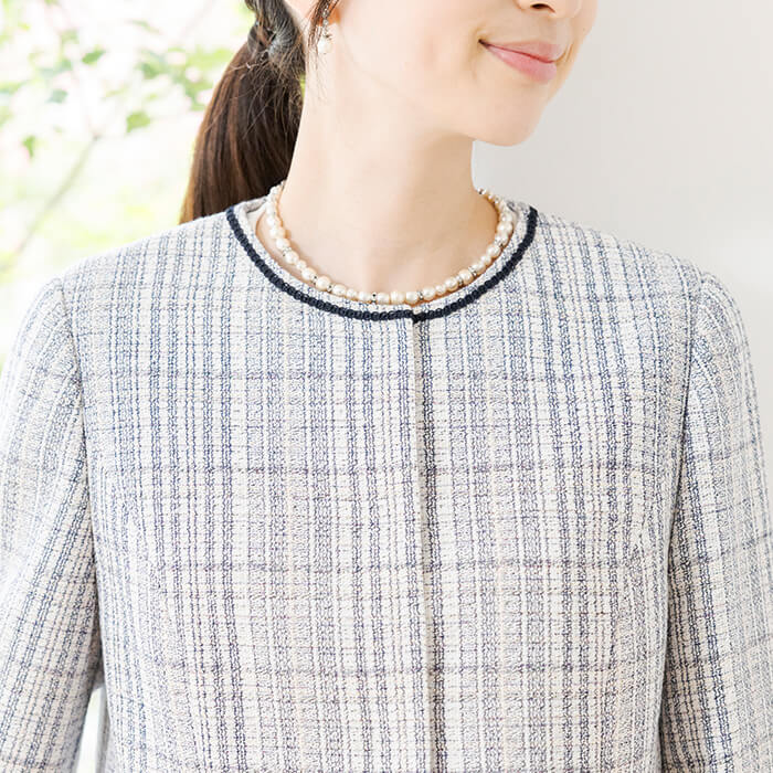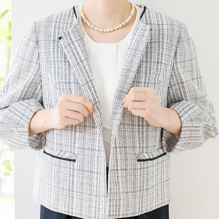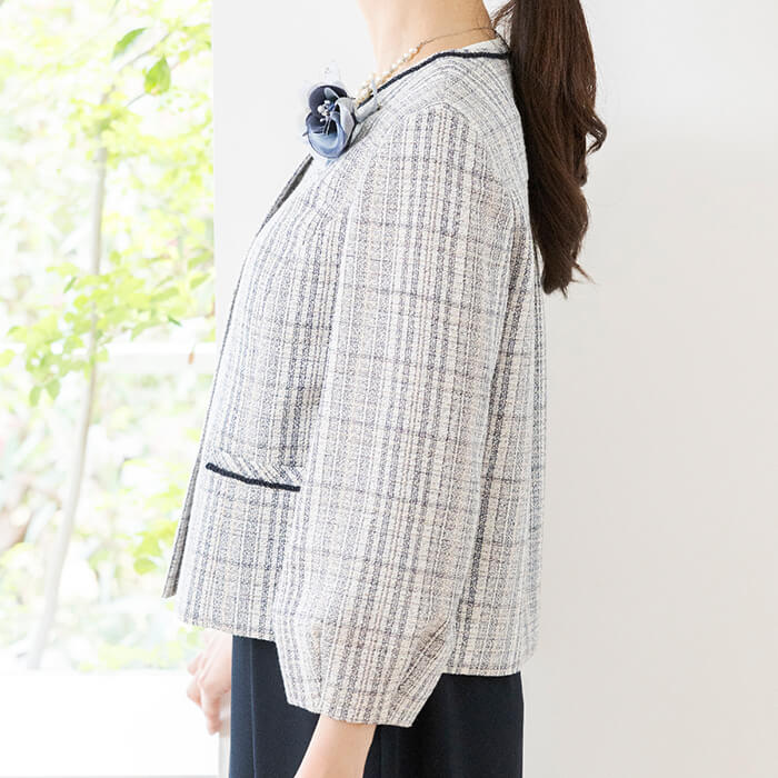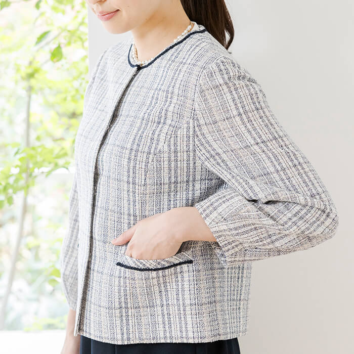 襟周りは、ポケット部分と同じブレードを配したデザイン。 お顔周りがぼやけずに、お写真映えもばっちり。