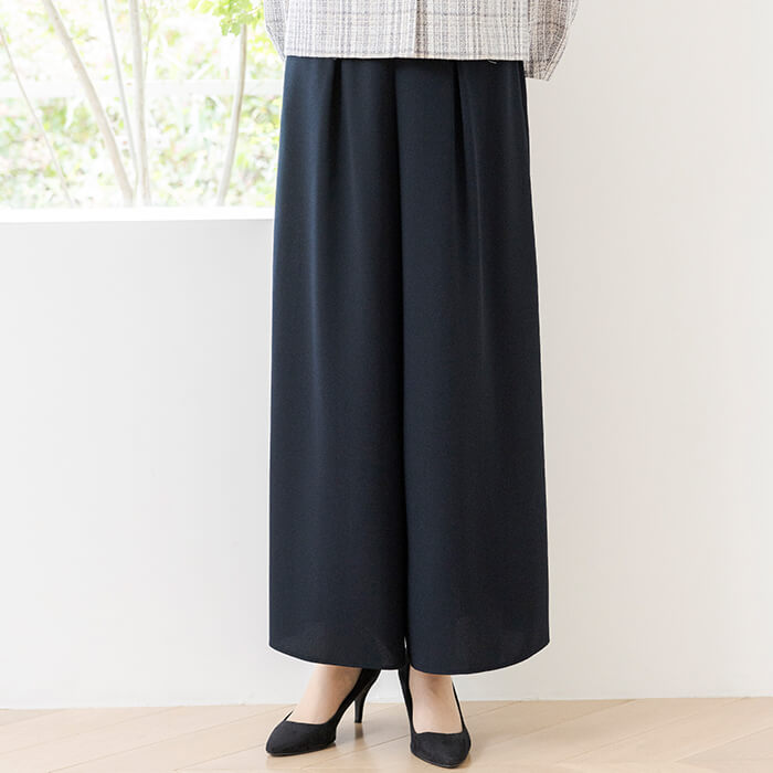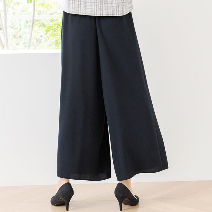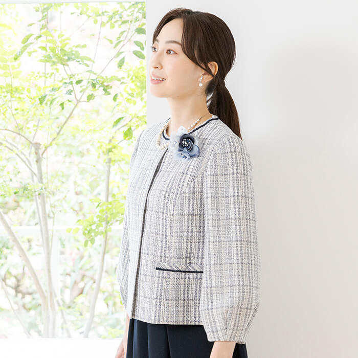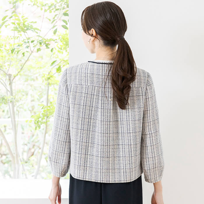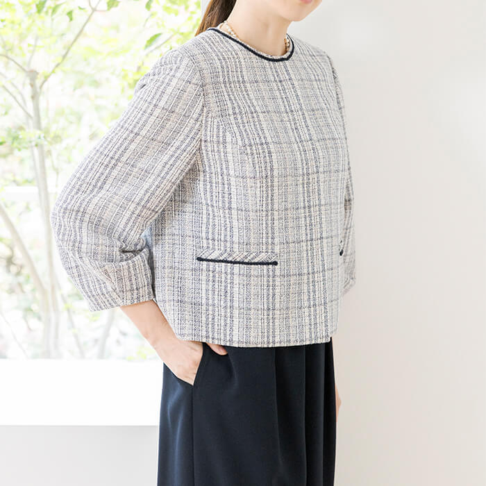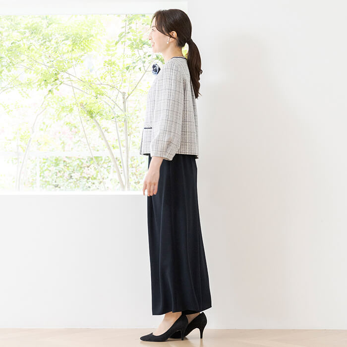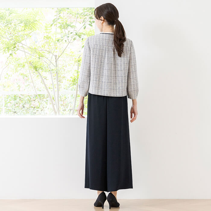 からみ風の軽やかなミックスツイードを使用したジャケットは、丈感はコンパクトに、トレンドのボリューム袖に仕上げた、やわらかな雰囲気。フロントは4か所のスナップで留める仕様です。 ワイドパンツは落ち感のある生地で、ワイドながらすっきり上品なシルエット。左脇側には着脱のファスナーがあり、後ろはゴム仕様でお腹周りすっきり。右脇にはポケット付きです。サイズはキャリア(30代〜40代)を中心としたメリハリのあるボディラインの方向けの標準パターンを使用。 パンツのみご自宅でお洗濯可能です。