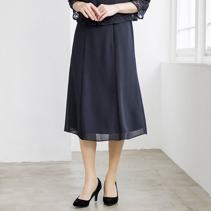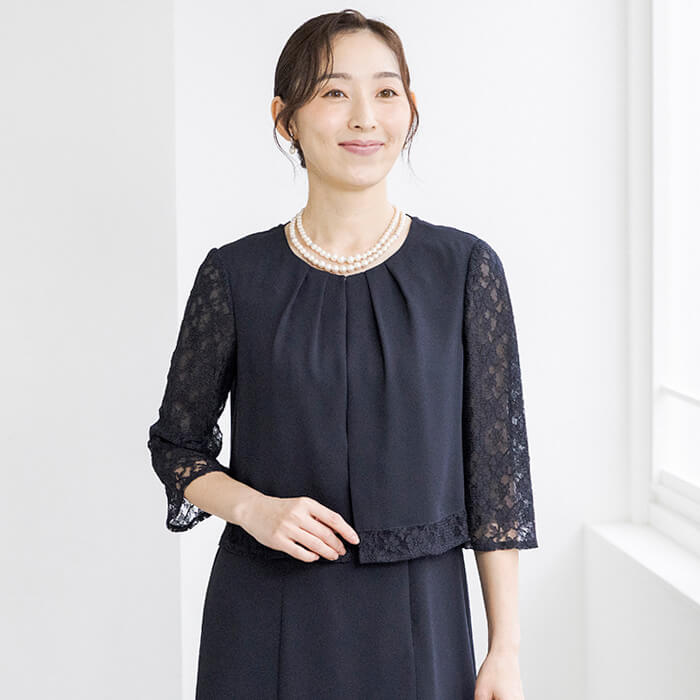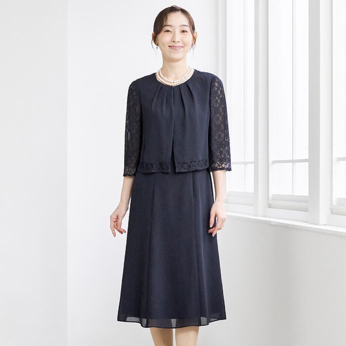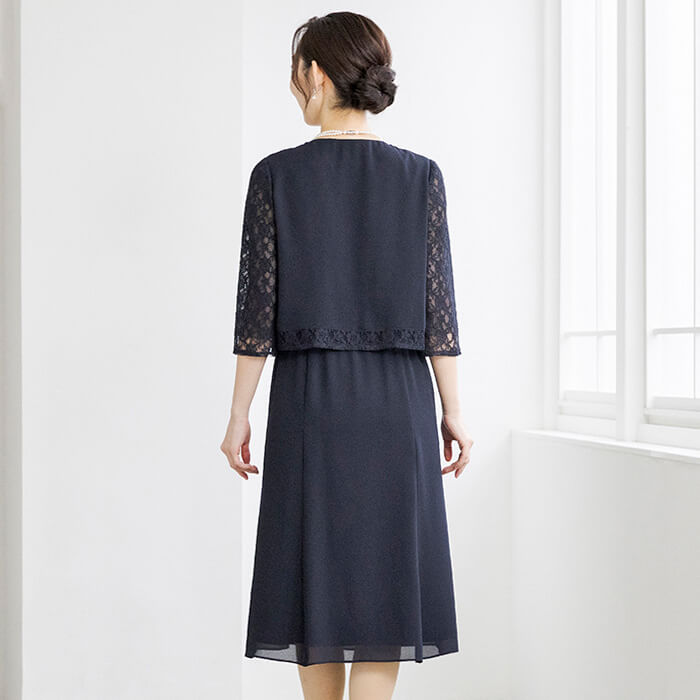 ワンピースはお腹周りをカバーするふらしシデザイン。前開きのファスナー仕様で、髪型を崩すことなく楽に着脱できます。繊細なレースがポイントのワンピースは、袖が涼しげで夏時期のパーティーにはワンピース1枚での着用もおすすめです。