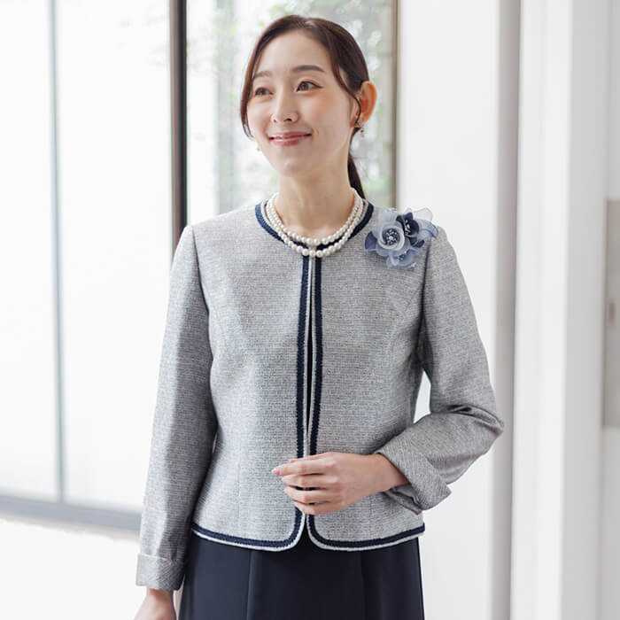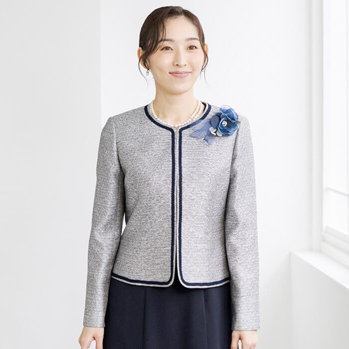 上質で高級感のある米沢織ジャカード素材で仕立てたジャケットは羽織るだけで凛とした印象に。縁取りしたブレードがアクセントになり、ジャカード素材をより引き立てます。袖はリターンカフスで長さの調整が可能です。