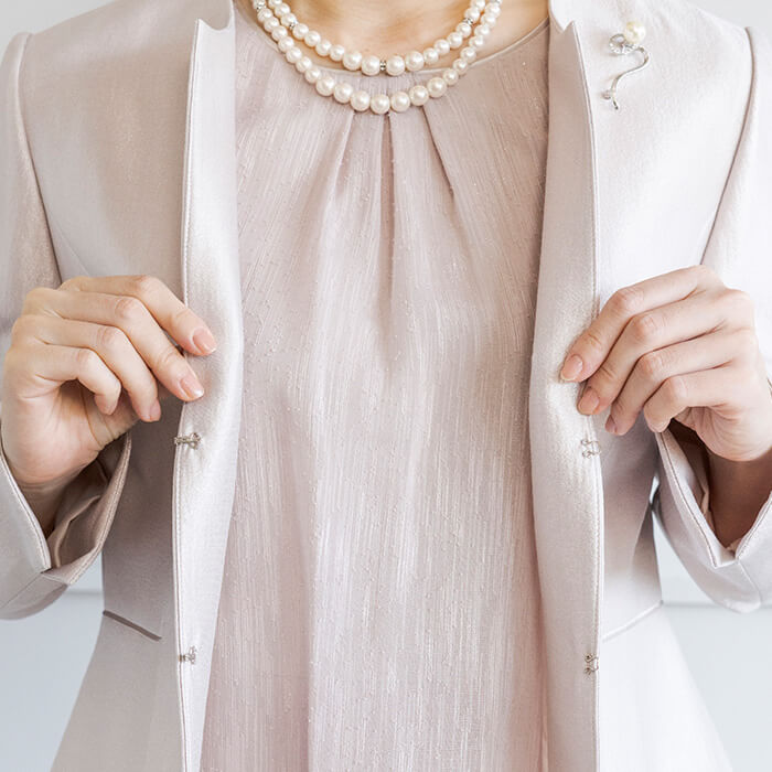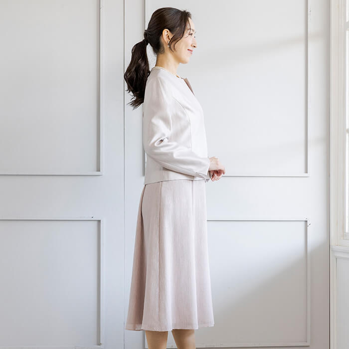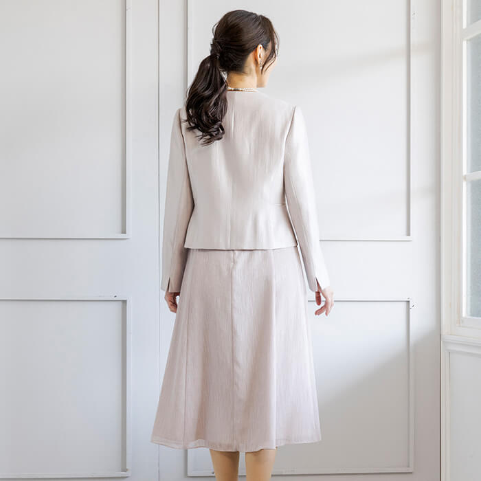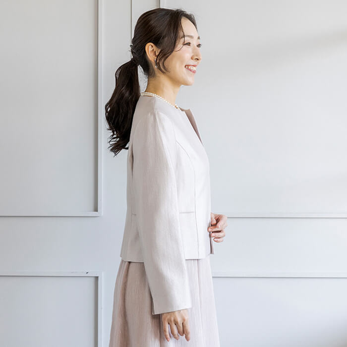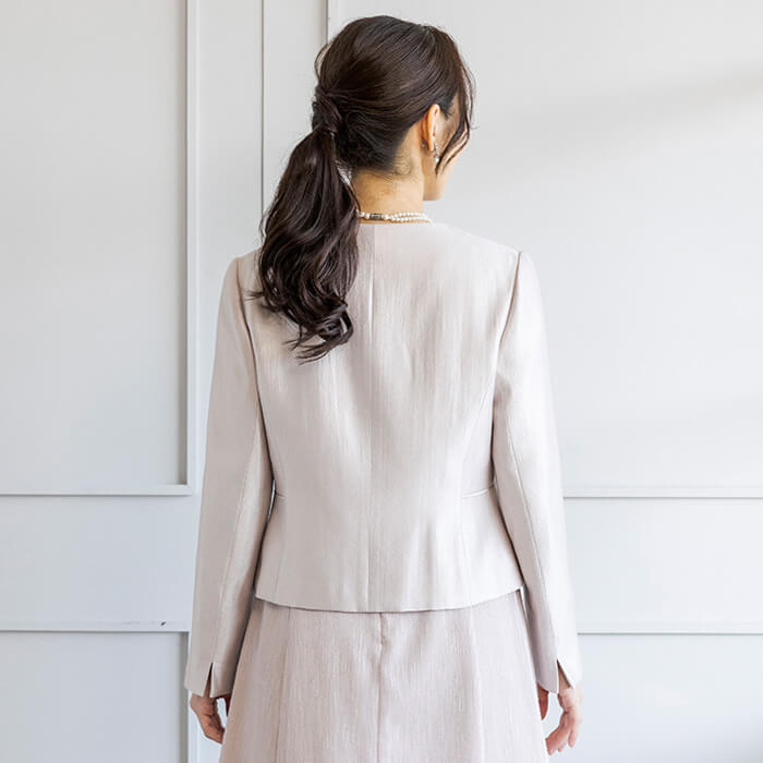シンプルなノーカラージャケット付きのワンピーススーツ。 結婚式やお顔合わせの食事会、七五三などのセレモニーシーンにおすすめです。