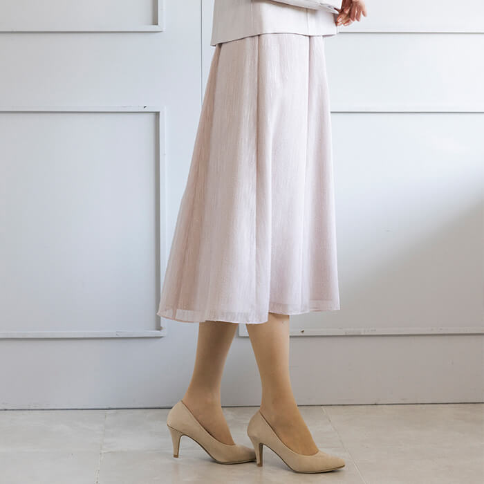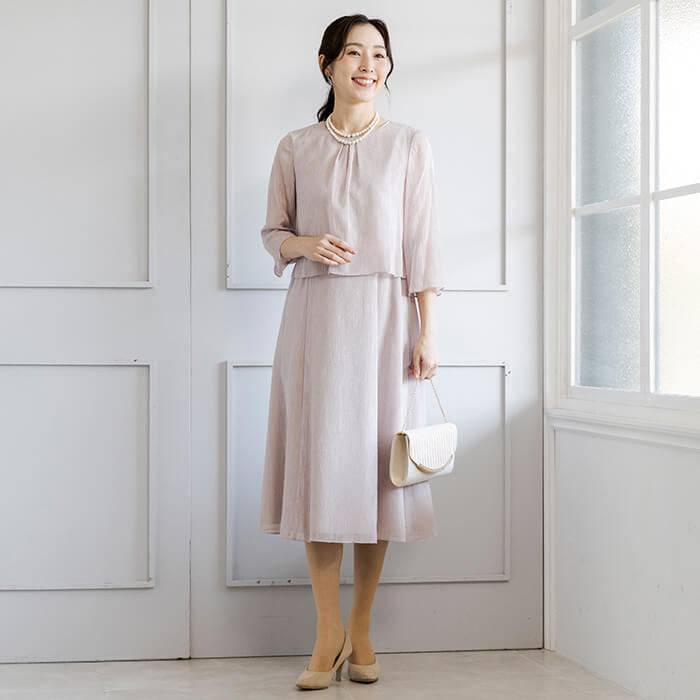 ジャケットは、ウエスト両脇に差し込んだサテンが程よいアクセント。 袖口は折り返せるリターンカフス式、袖丈の調整ができます。 ワンピースは、ほんのりラメ糸を使用したジャカード素材。 ウエストは楽な着心地のゴム入りで、お腹周りをカバーするふらしのデザインです。 ジャケット、ワンピースともオールシーズン対応、単品でも活躍する優秀アイテム。 アクセサリーを添えて、結婚式のゲストドレスとしてもおすすめです。