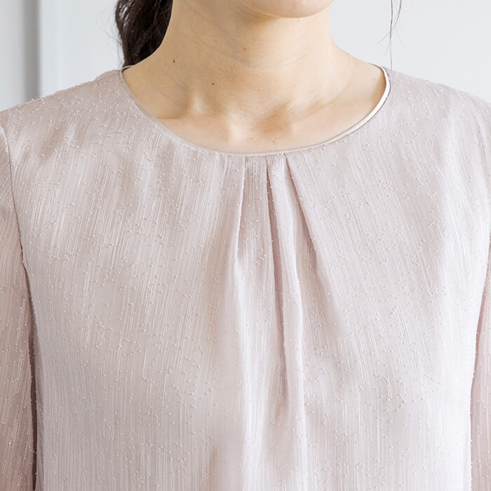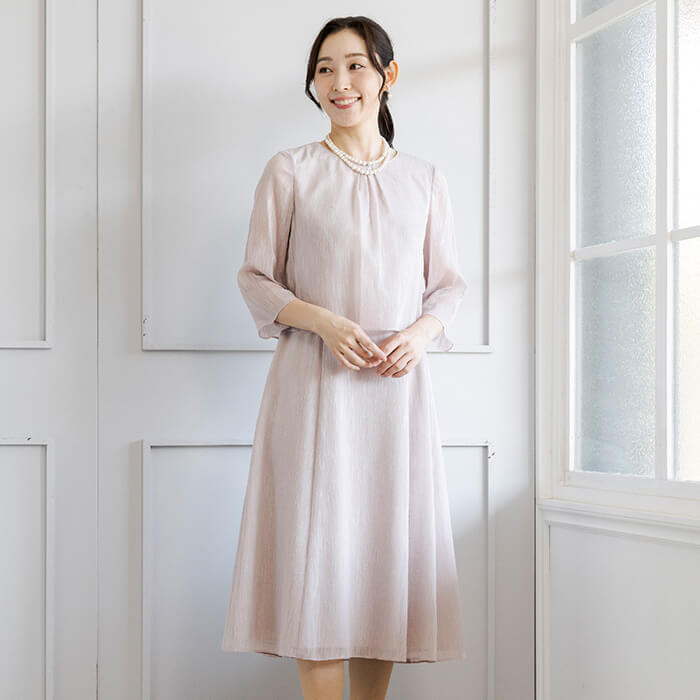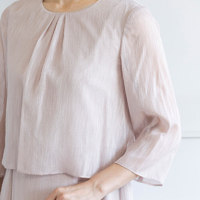 ワンピースの袖は肘が隠れる七分丈。 程よい透け感がエレガントです。
