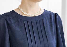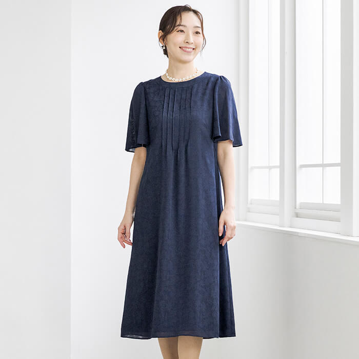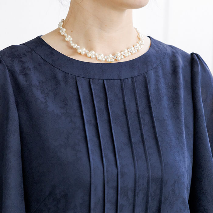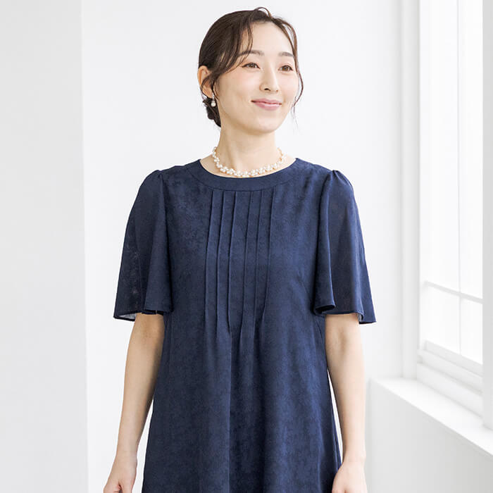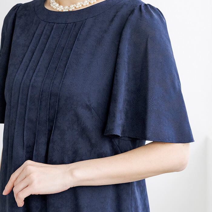 胸元のピンタックと二の腕をカバーするラッフルスリーブがポイント。