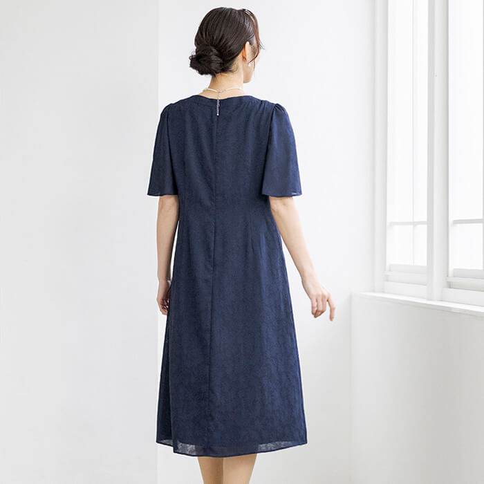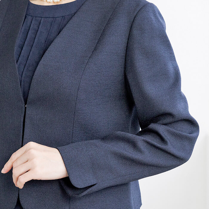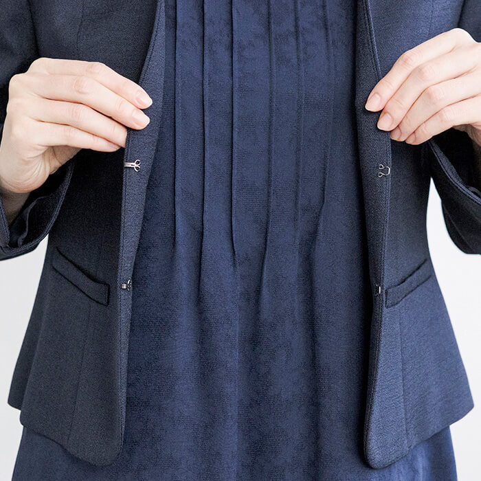 ジャケットはドライタッチで軽い麻調素材を使用。Vネックラインですっきりとしたデザイン。ウエストの箱ポケットがポイントに。袖はリターンカフスで長さの調整が可能です。ワンピースは程よい透け感が涼しげな花柄のからみジャカード素材を使用。胸元のピンタックと二の腕をカバーするラッフルスリーブがポイント。