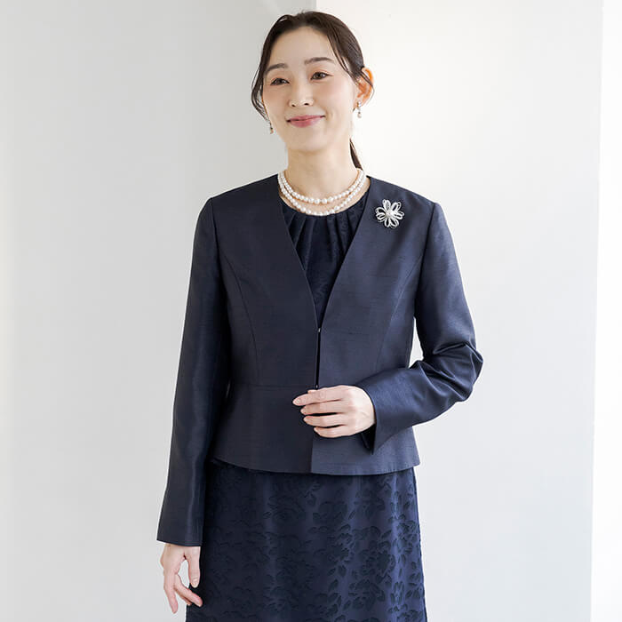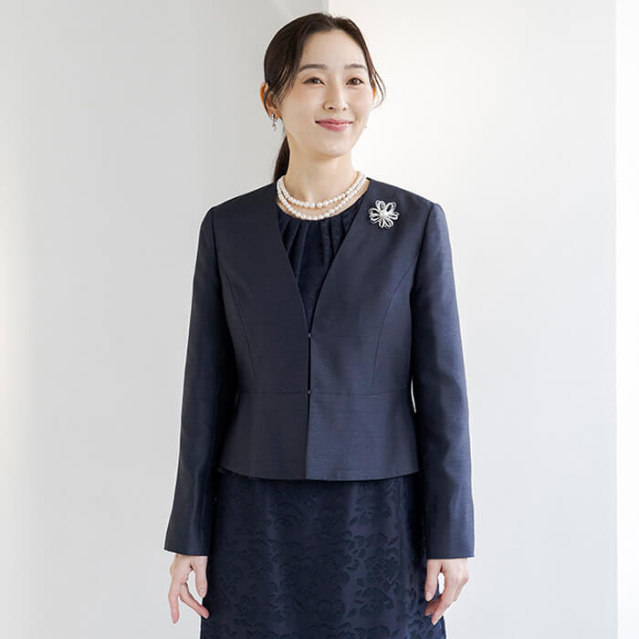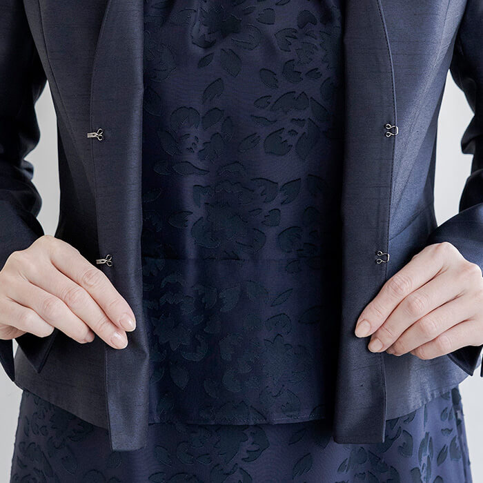 ジャケットはシンプルなノーカラージャケット。 高級感のあるシャンタン素材を使用しており華やかな印象でご着用いただけます。 袖口は長さを調整できるスリット入りのリターンカフス式。