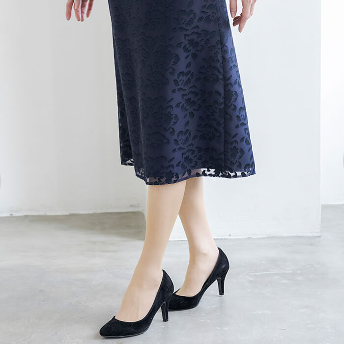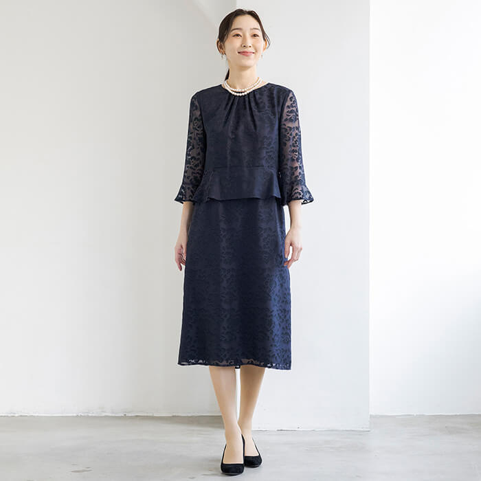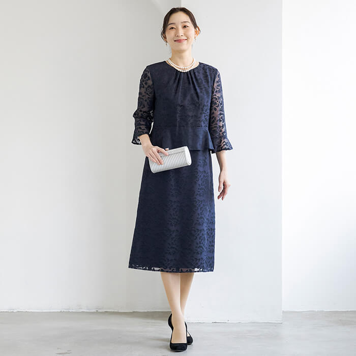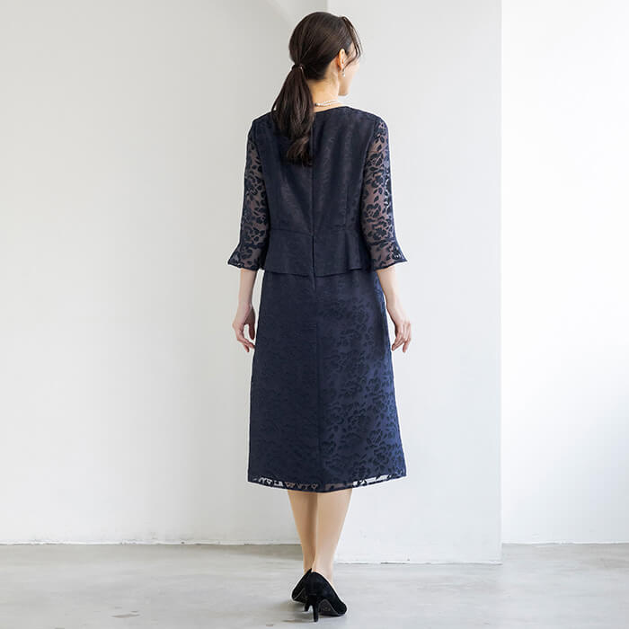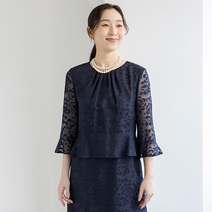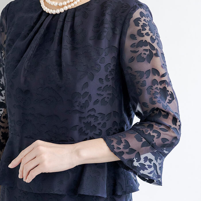 ワンピースの袖は肘が隠れる七分丈。程よい透け感がエレガントです。