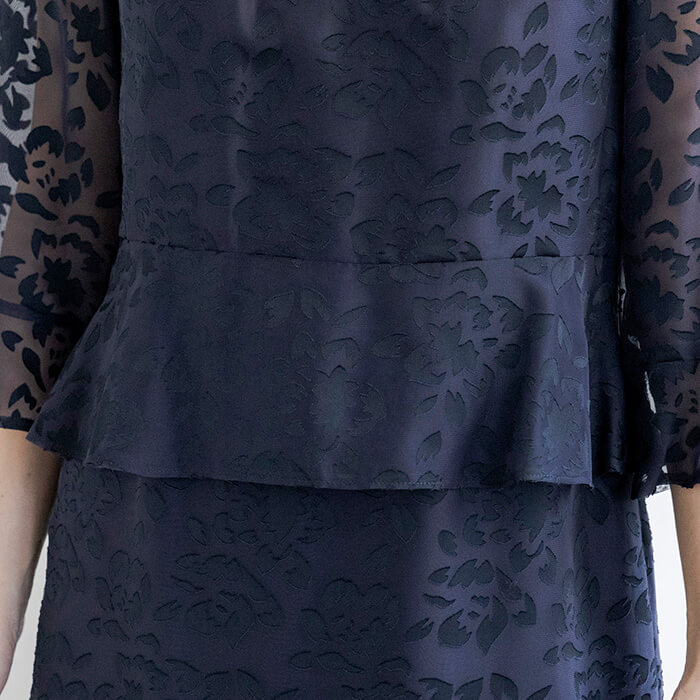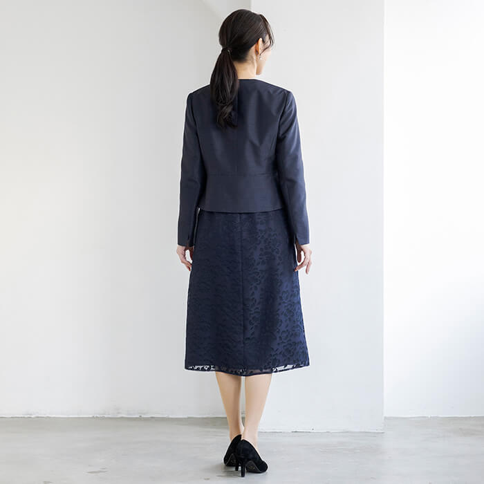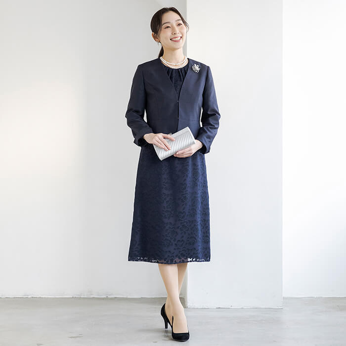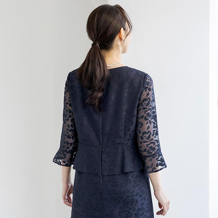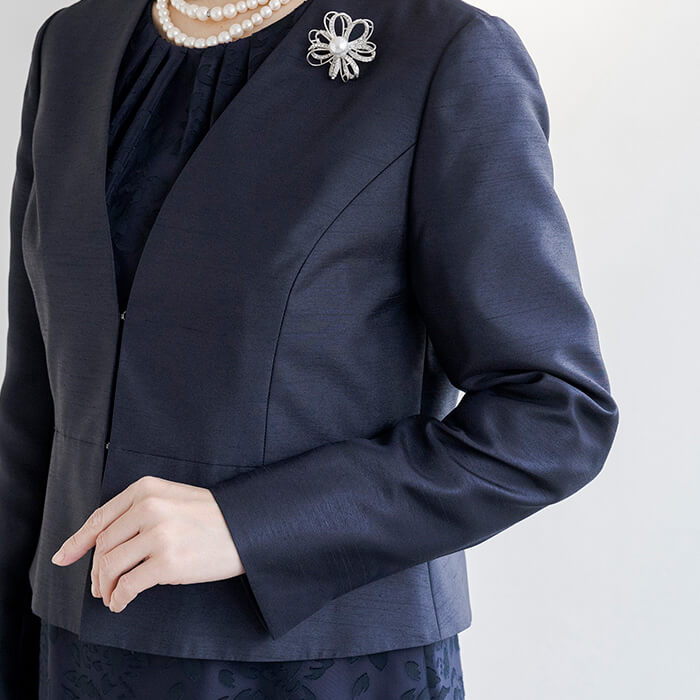 高級感のあるシャンタン素材のジャケットと花柄モチーフのオパール素材が華やかなワンピースのアンサンブル。 結婚式、卒入学式、お顔合わせ、七五三やお食事会など、フォーマルシーンにおすすめです。