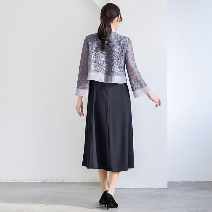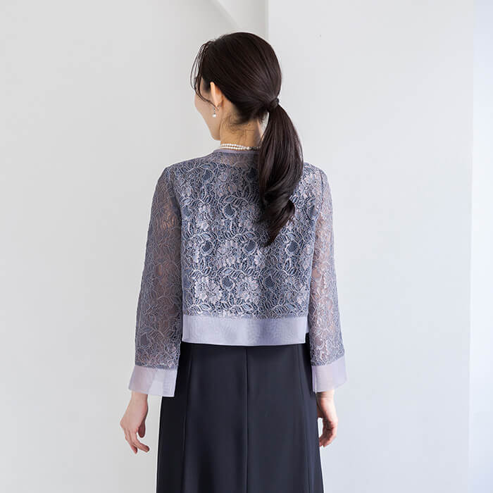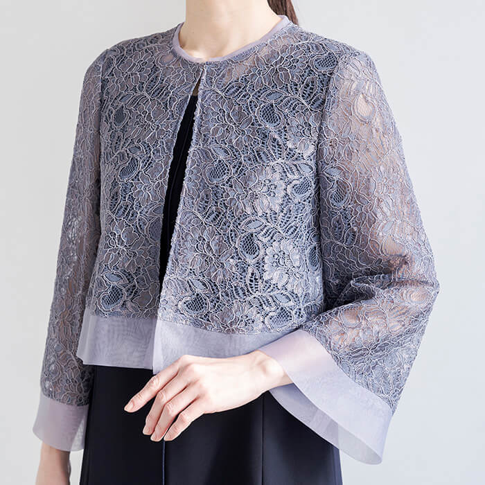 レースとオーガンジーで仕立てた、軽やかなボレロ風ジャケット。 華やかな花柄コードレースにオーガンジーを重ね、さっと羽織るだけで上品な印象に導きます。 どんなワンピースともバランスよく合わせやすい着丈で、フォーマル感のある装いを引き立てます。