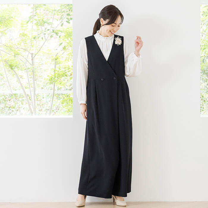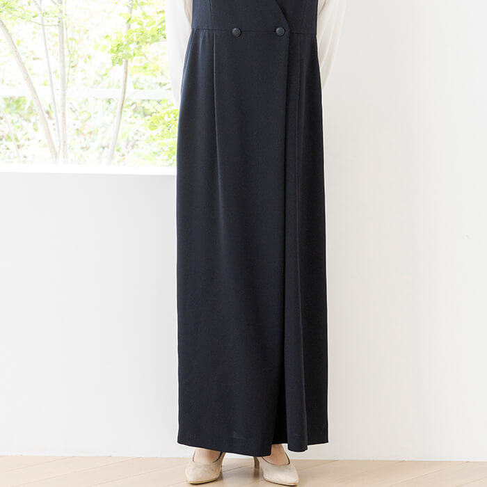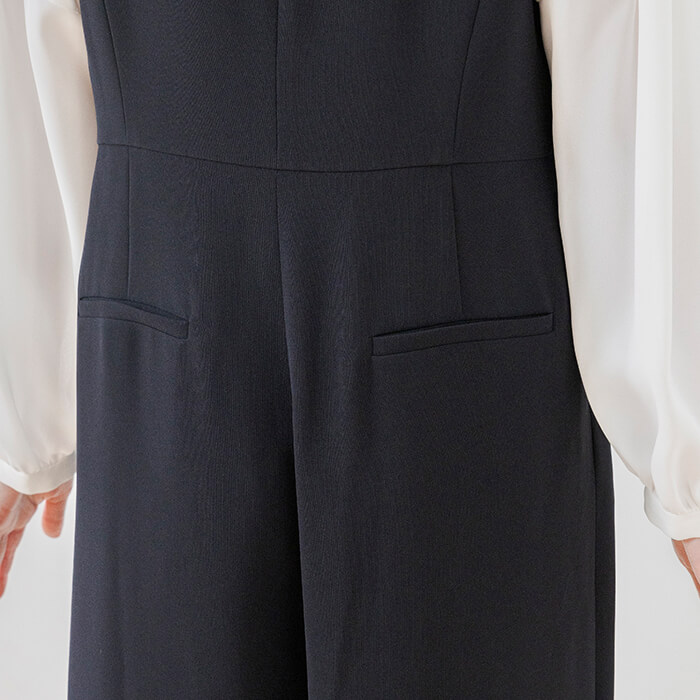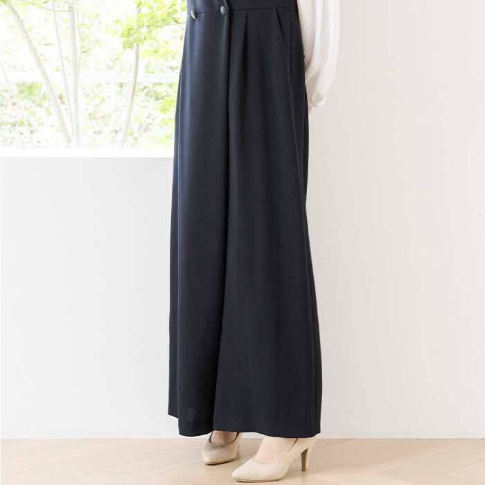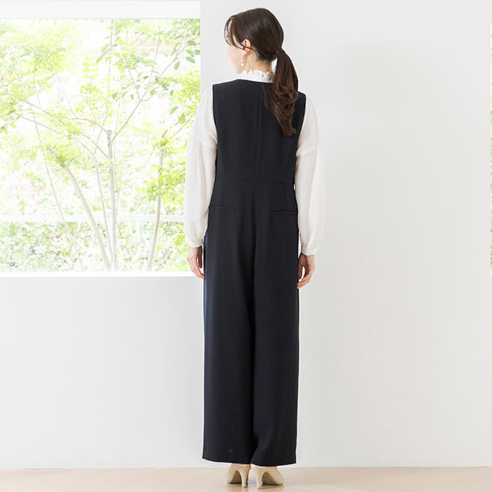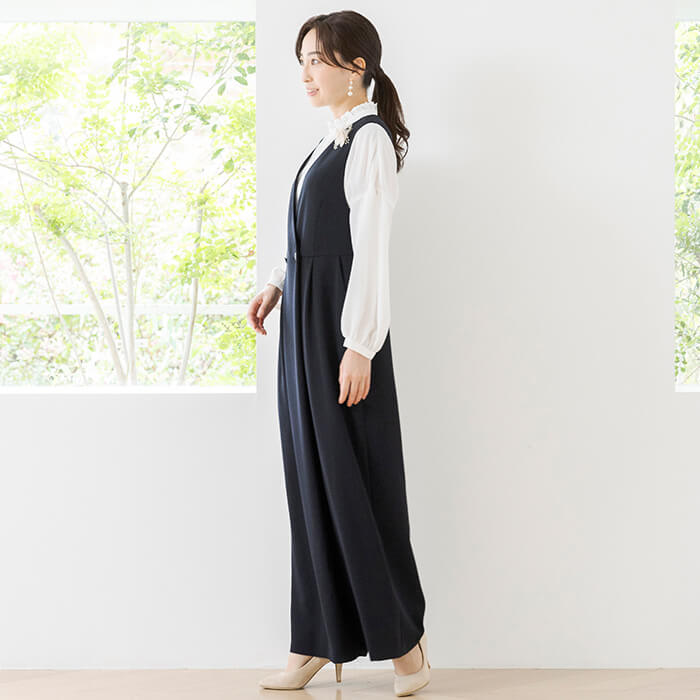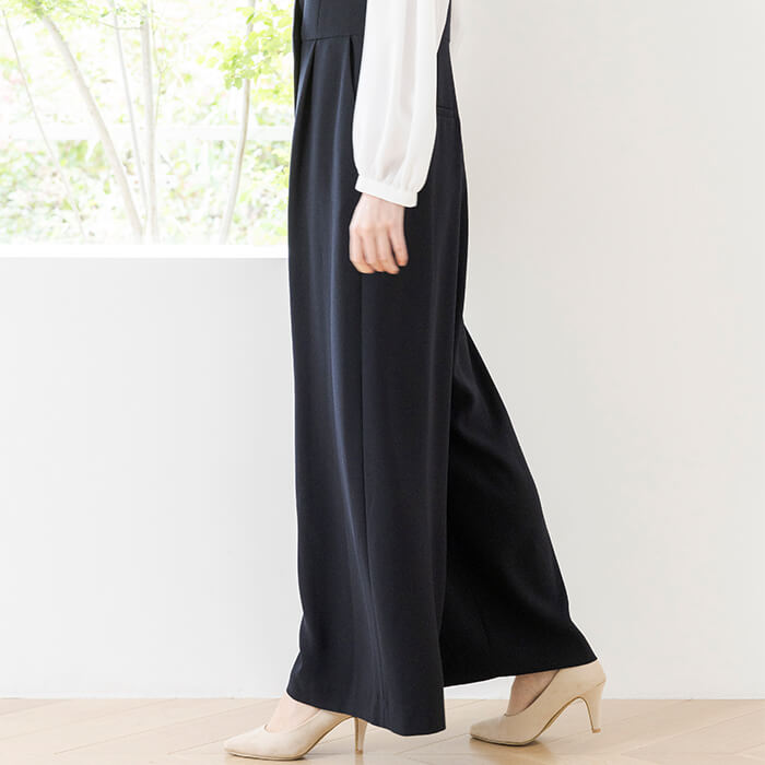 フロントがカシュクールになったラップパンツタイプのオールインワン。 ヒップから裾にかけての程よいワイドシルエットが特徴。 肩回りやウエストはややスリムに仕上げ、全体的にもたつき過ぎない、メリハリのある雰囲気に仕上げました。
