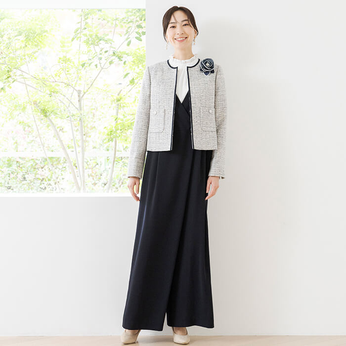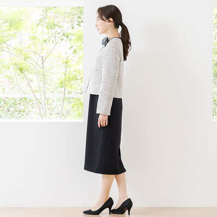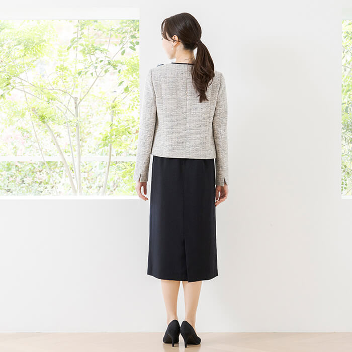 多色の糸をミックスしたツイードのため、様々なカラーのアイテムと合わせやすいのもポイント。 お手持ちのパンツやワンピースに合わせるだけでフォーマルなスタイリングになるため、1着持っていると便利なアイテムです。