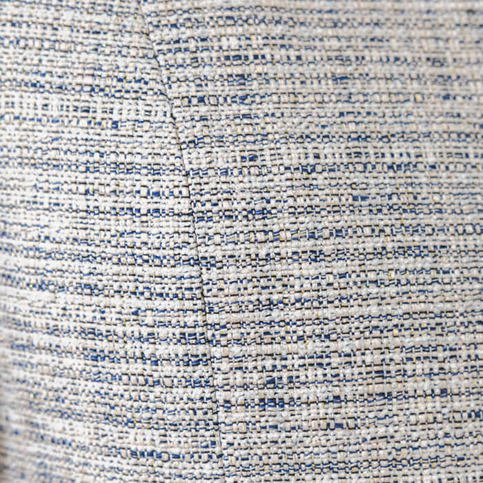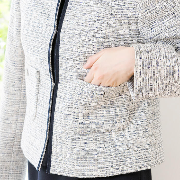 襟ぐりと前端をネイビーの配色テープで引き締めたツイードジャケット。